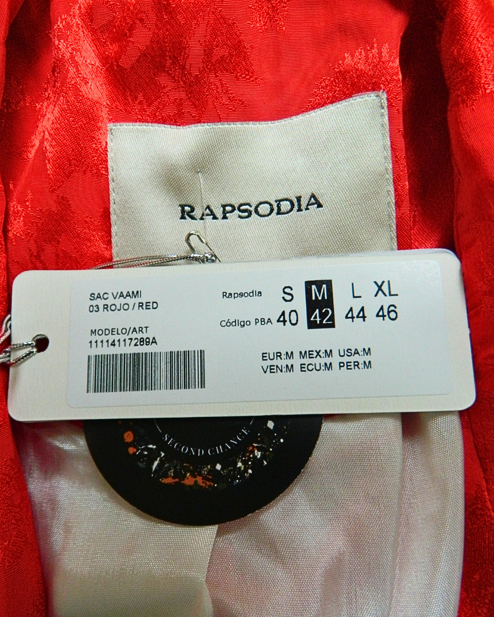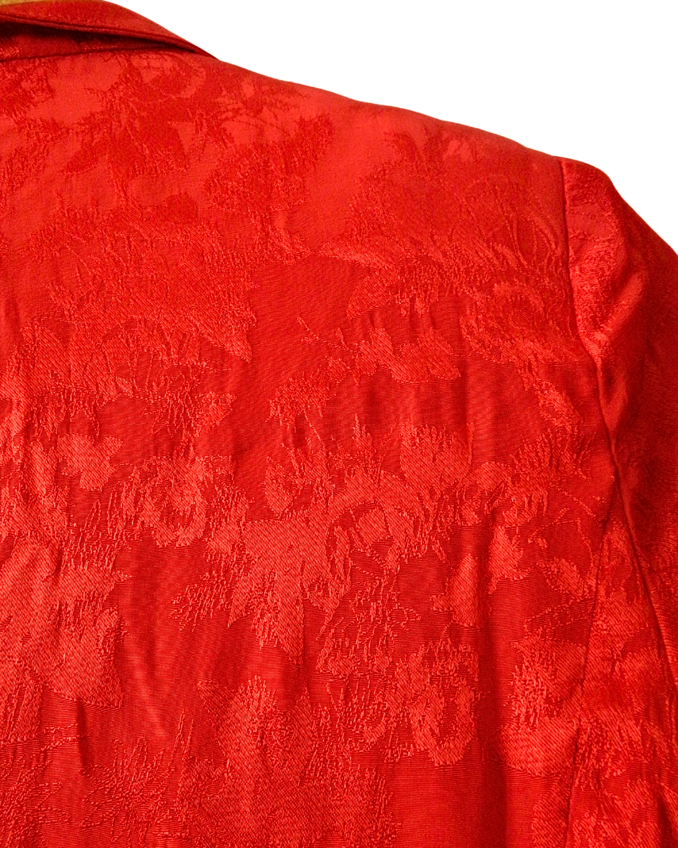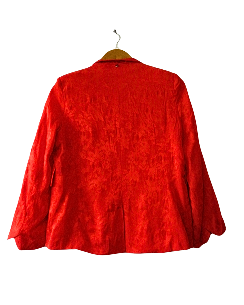 Blazer Rapsodia modelo Vaami en color rojo. Su corte es clásico con solapas y bolsillos, abierto, sin botones. Su liviana tela está trabajada con un patrón muy sutil de flores en mismo color. Su interior es totalmente forrado en acetato natural. Estilo bohemio y romántico característico de la marca.