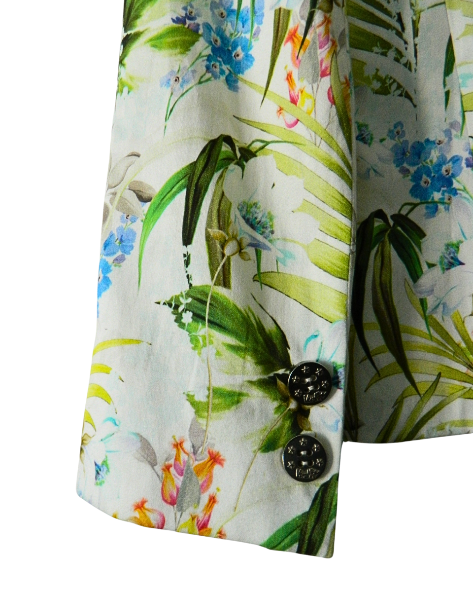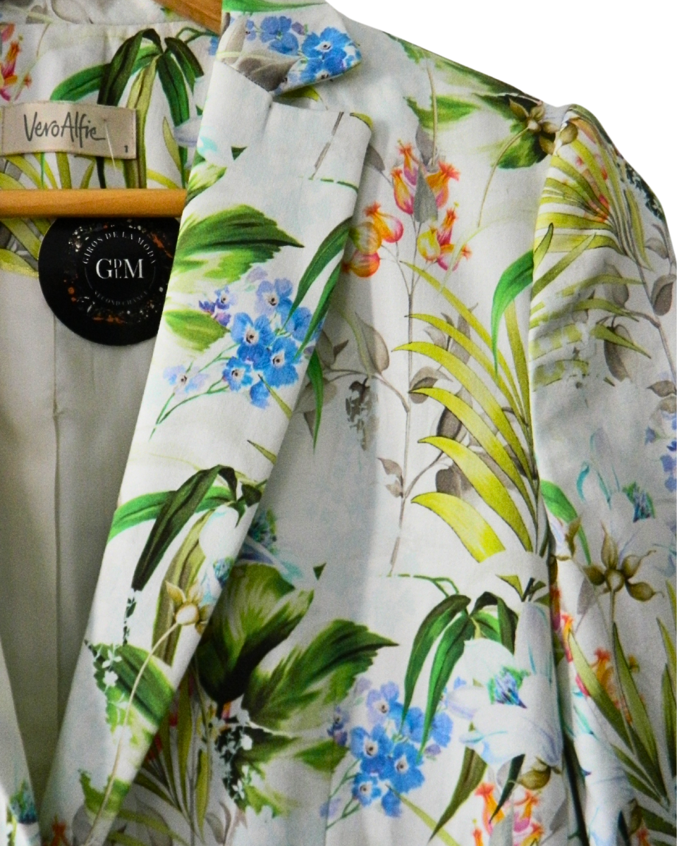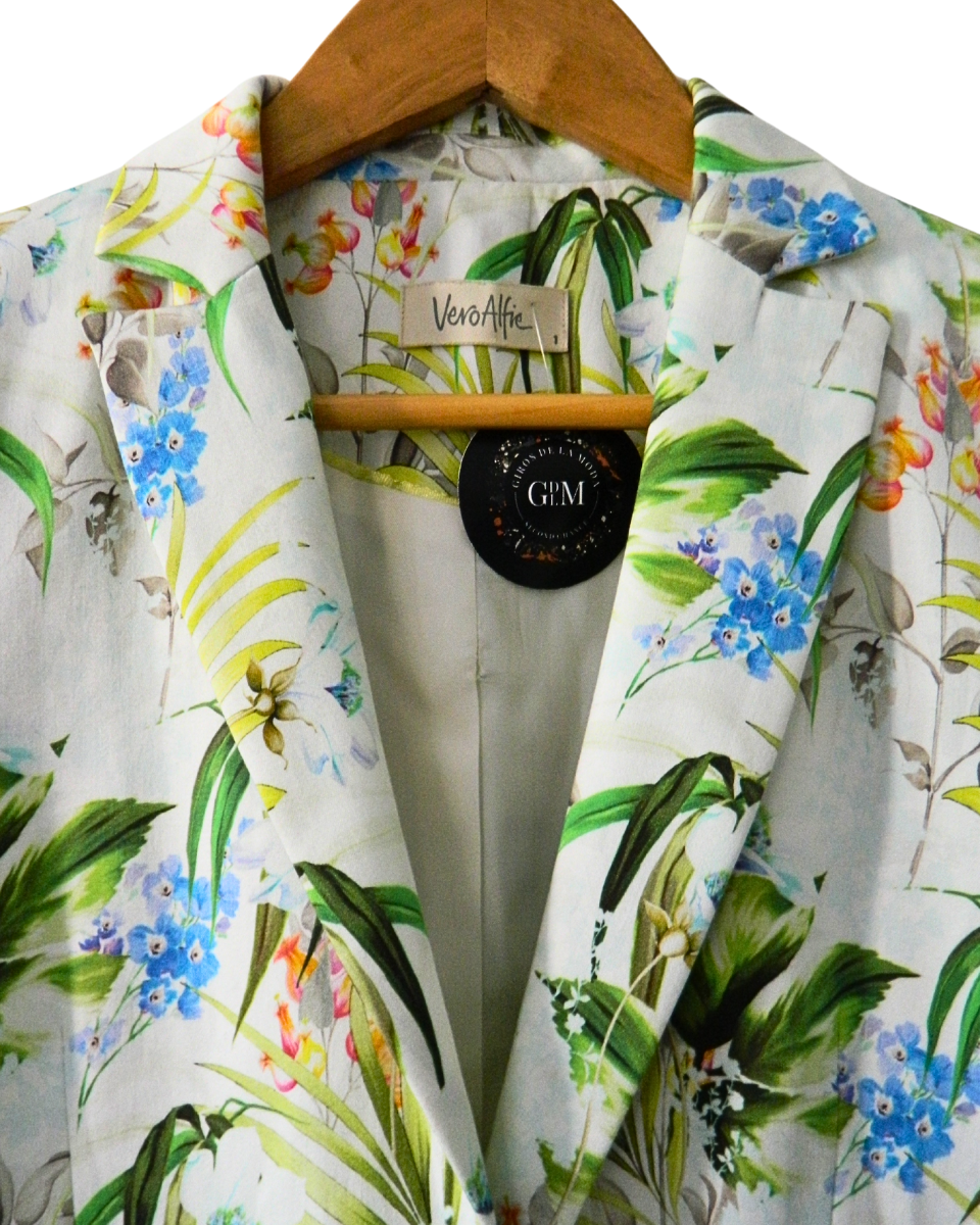 Blazer Vero Alfie de diseño exclusivo, color natural con estampado de hojas y pequeñas flores. Diseñado con cuello solapa, con dos bolsillos ojal y un botón metálico con sello de la marca. En sus puños posee dos botones metálicos con el sello de la marca. Su interior es totalmente forrado en acetato color natural.