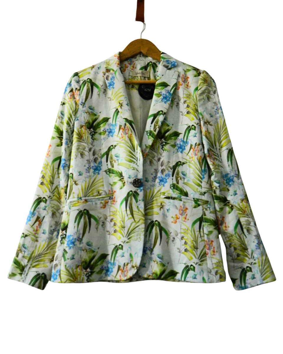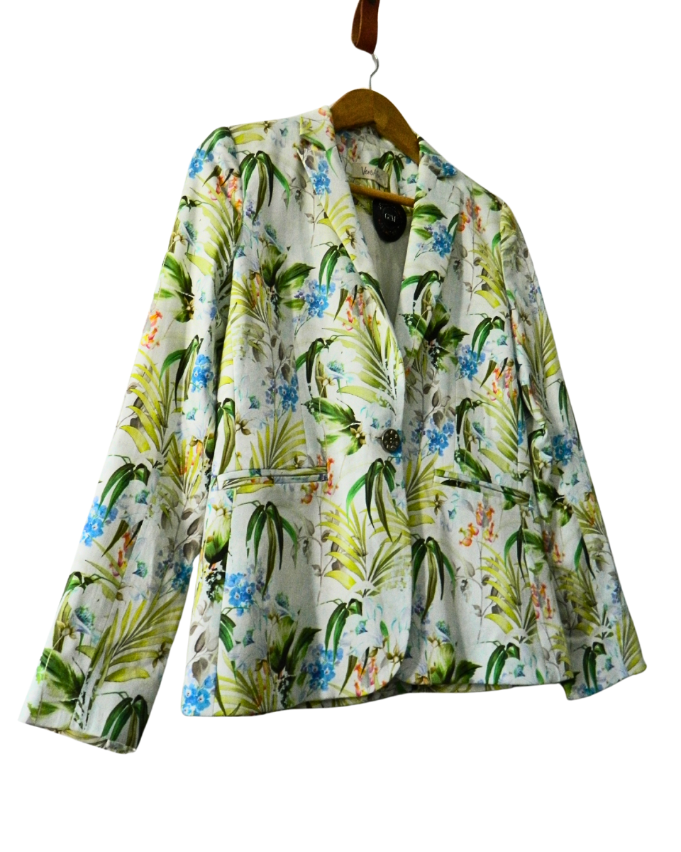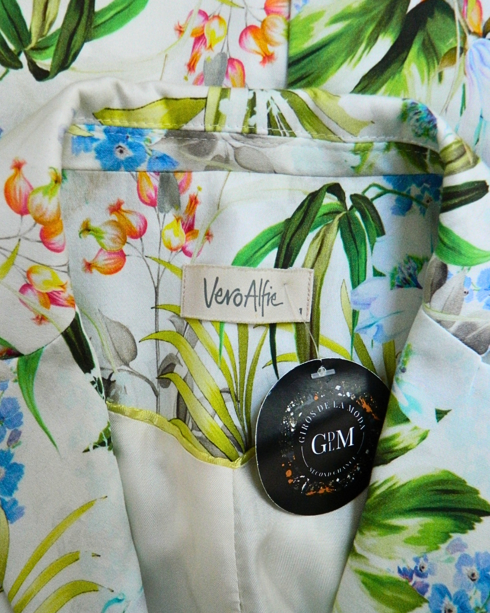 Blazer Vero Alfie de diseño exclusivo, color natural con estampado de hojas y pequeñas flores. Diseñado con cuello solapa, con dos bolsillos ojal y un botón metálico con sello de la marca. En sus puños posee dos botones metálicos con el sello de la marca. Su interior es totalmente forrado en acetato color natural.