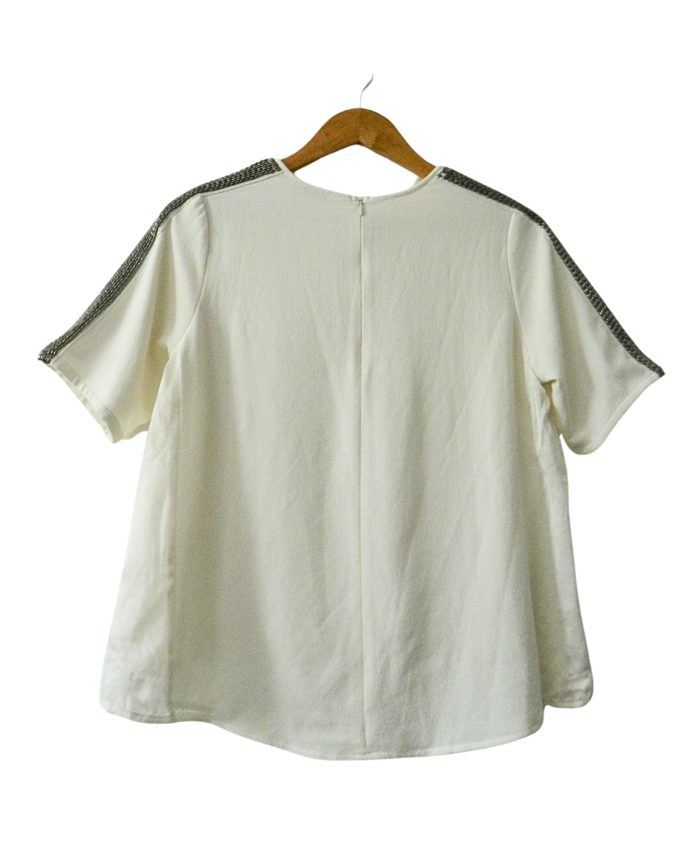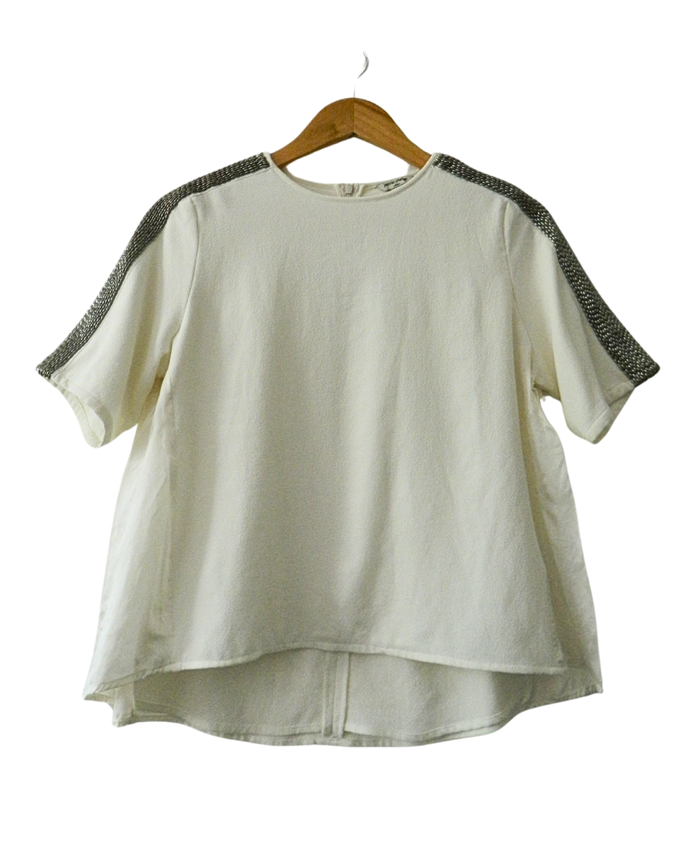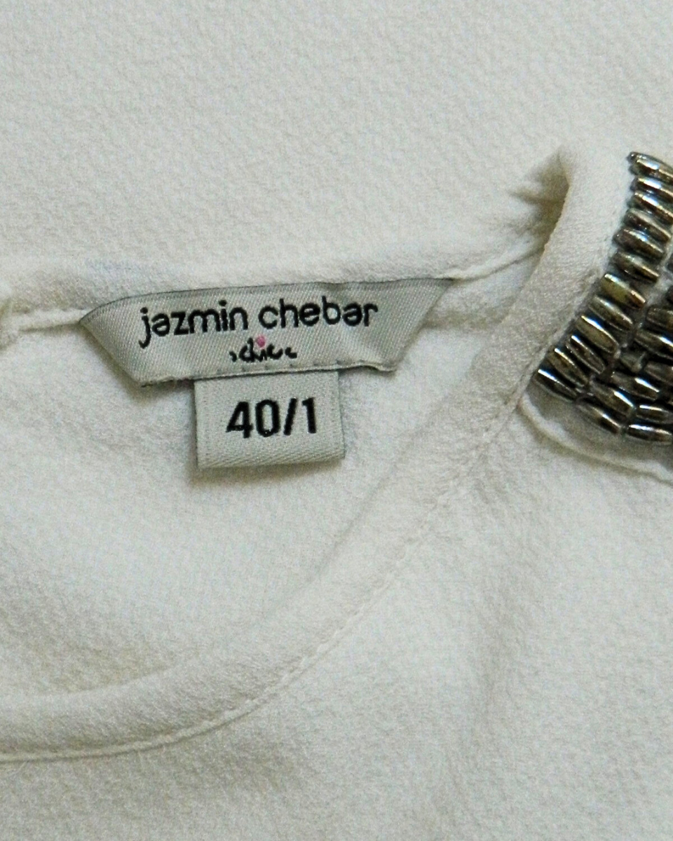 Blusa Jazmin Chebar de crepe en color natural.Posee un delicado bordado de canutillos plateados en hombros y mangas y tela de seda en laterales. Su corte es amplio mas corta en frente y mas larga en espalda, con mangas cortas y cierre oculto en espalda. Su interior es forrado en frente y espalda.