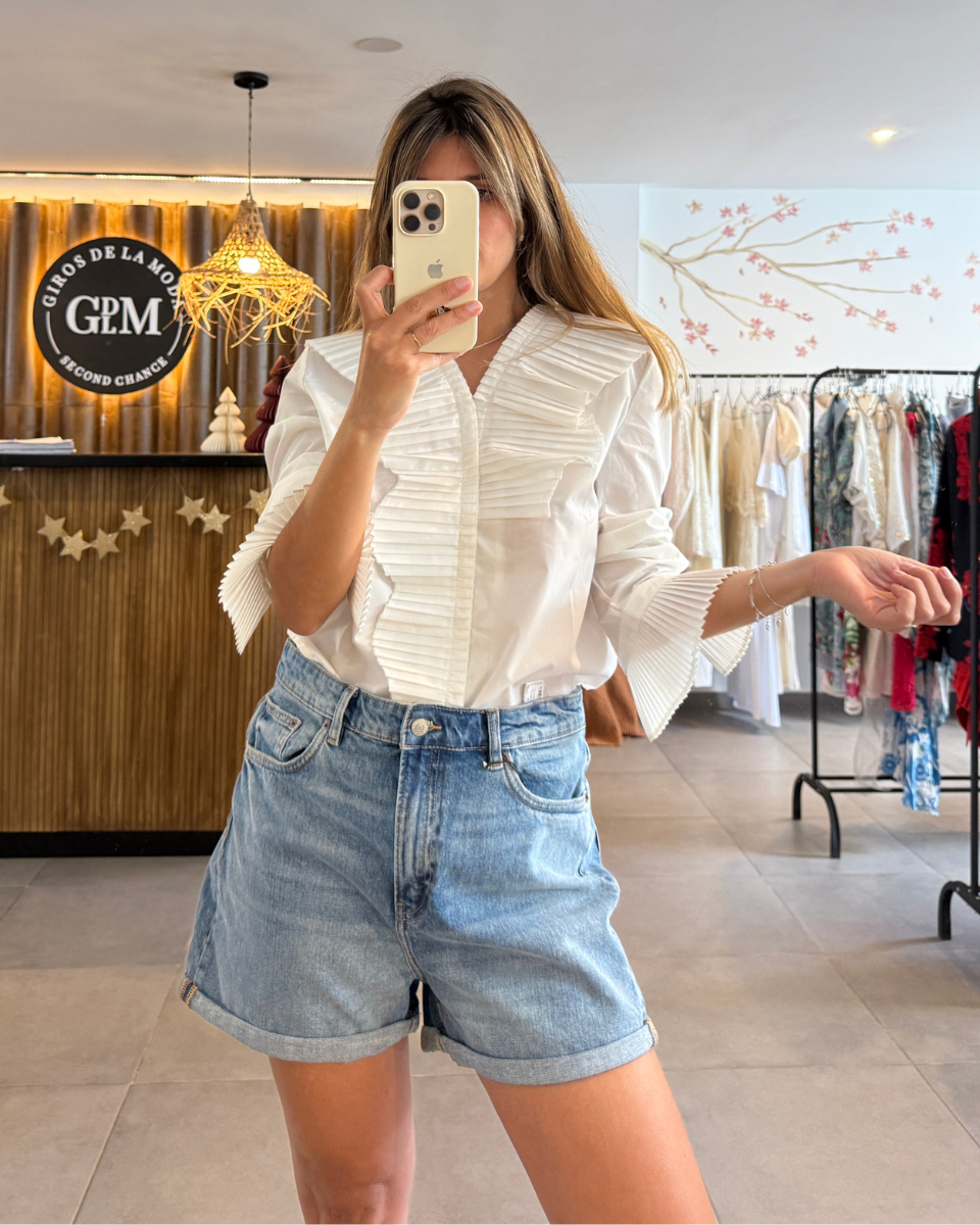 Blusa My Style de diseño romántico, presenta detalles de volados plisados en el frente y las mangas, una tendencia que reinterpreta la elegancia clásica con un toque moderno. Ideal para un look boho chic con jeans o para un atuendo más formal con pantalones de vestir.