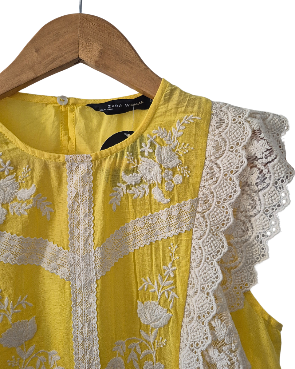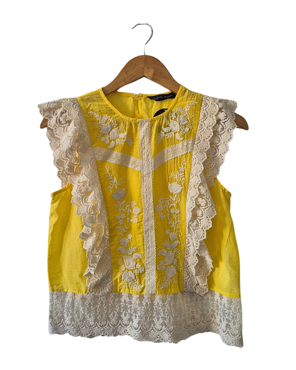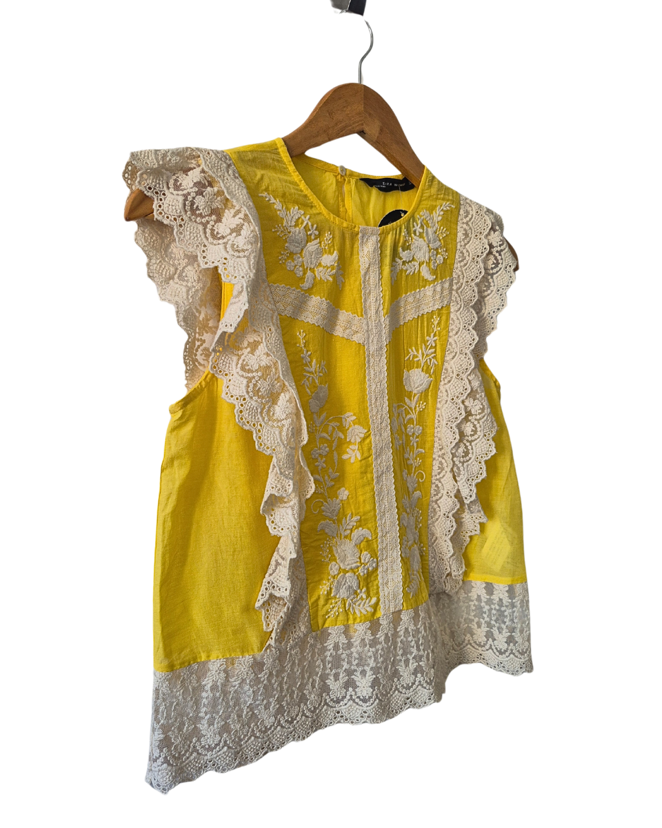 Blusa Zara liviana sin mangas color amarilla. Diseñada con cuello redondo, posee bordado de flores en color natural en frente y apliques de tul con volados de encaje que van del frente a la espalda. En cadera tambien posee tul bordado con flores y encaje.