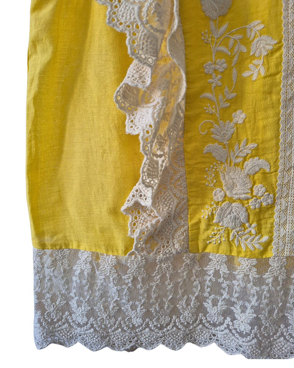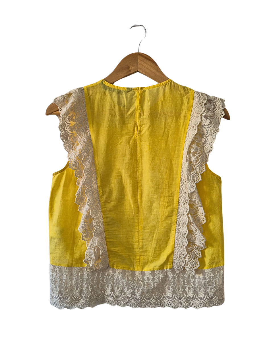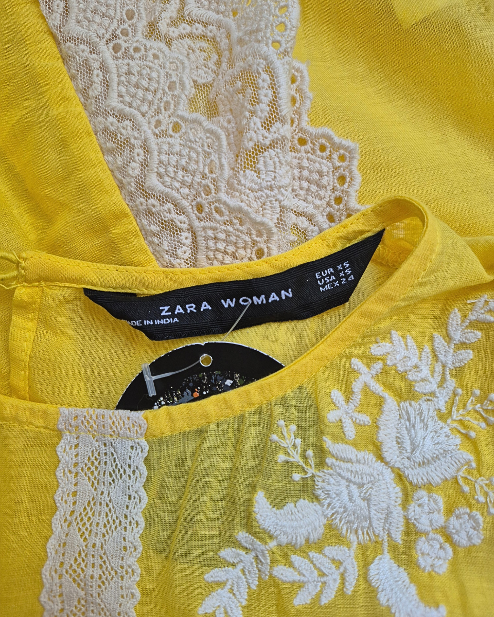 Blusa Zara liviana sin mangas color amarilla. Diseñada con cuello redondo, posee bordado de flores en color natural en frente y apliques de tul con volados de encaje que van del frente a la espalda. En cadera tambien posee tul bordado con flores y encaje.