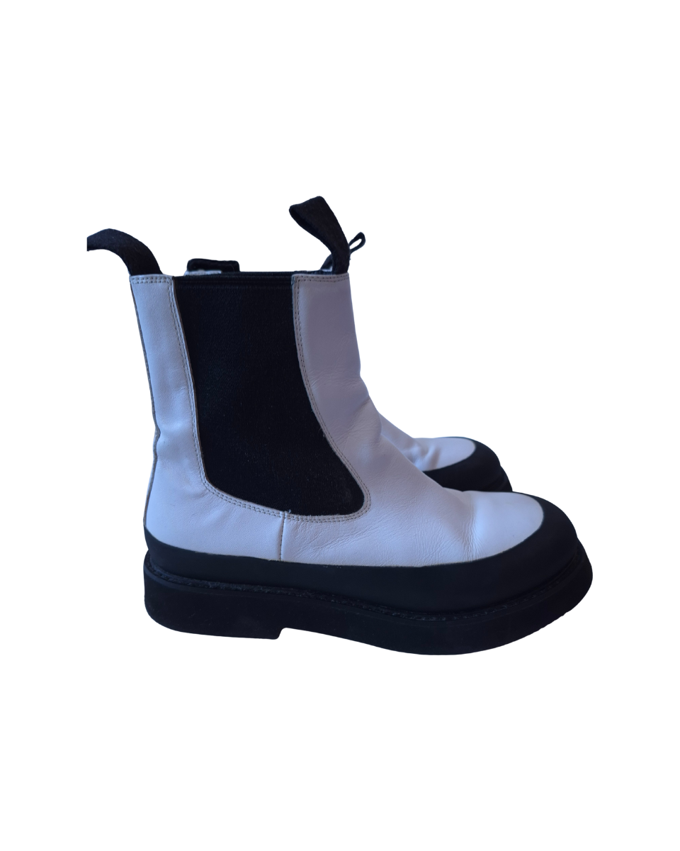 Botas Sarkany modelo Buda. Diseñadas con caña media, confeccionadas en cuero blanco, combina con dos tiras elasticas negras en cada lateral lo que le permite un calce y ajuste perfecto y una franja de caucho negro en parte inferior. Su suela es de goma negra.