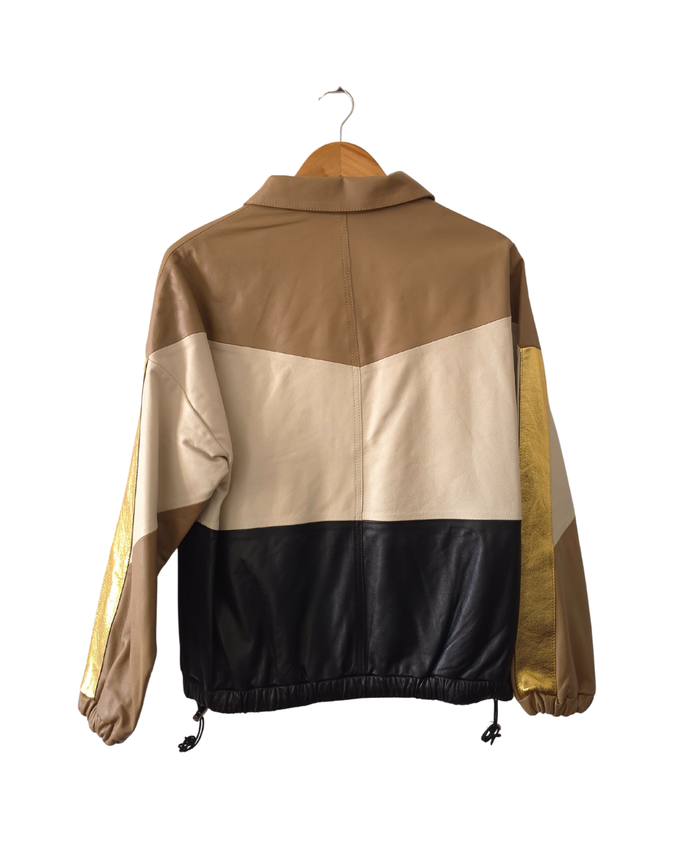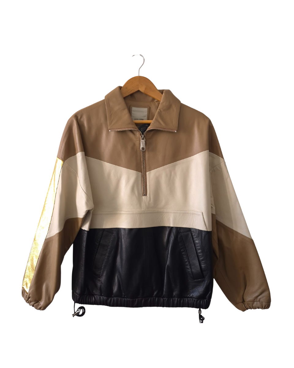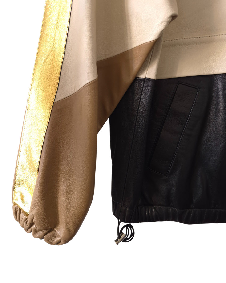 Buzo Jazmin Chebar oversize. Confeccionado en cuero ovino de alta calidad, presenta un diseño innovador con bloques que combina tonos camel, natural, negro y un impactante detalle dorado metálico en las mangas, ofreciendo una estética moderna y audaz. Posee bolsillos frontales, cuello alto y cierre de cremallera hasta la mitad, ideal para un look casual chic o para elevar cualquier outfit. Bajo ajustable con cordón y elástico para un calce perfecto y puños elásticos que brindan comodidad. Su interior es totalmente forrado en acetato negro con bordado de la marca (jch). Perfecto para combinar con jeans, pantalones de cuero o faldas, añadiendo un toque de exclusividad a tu vestuario.