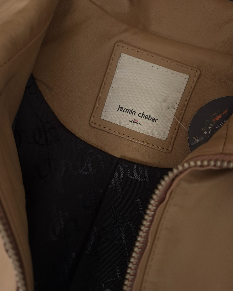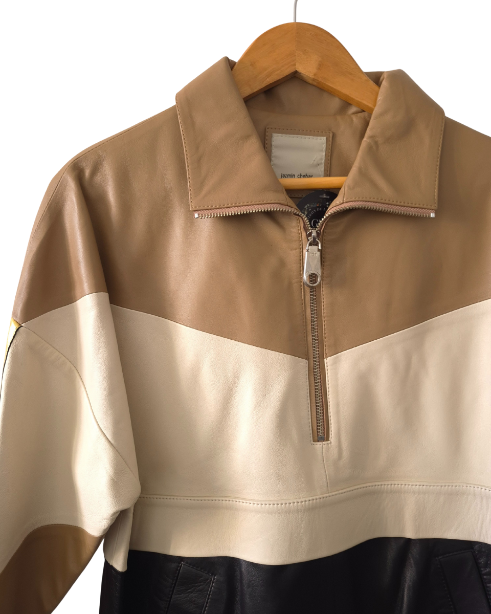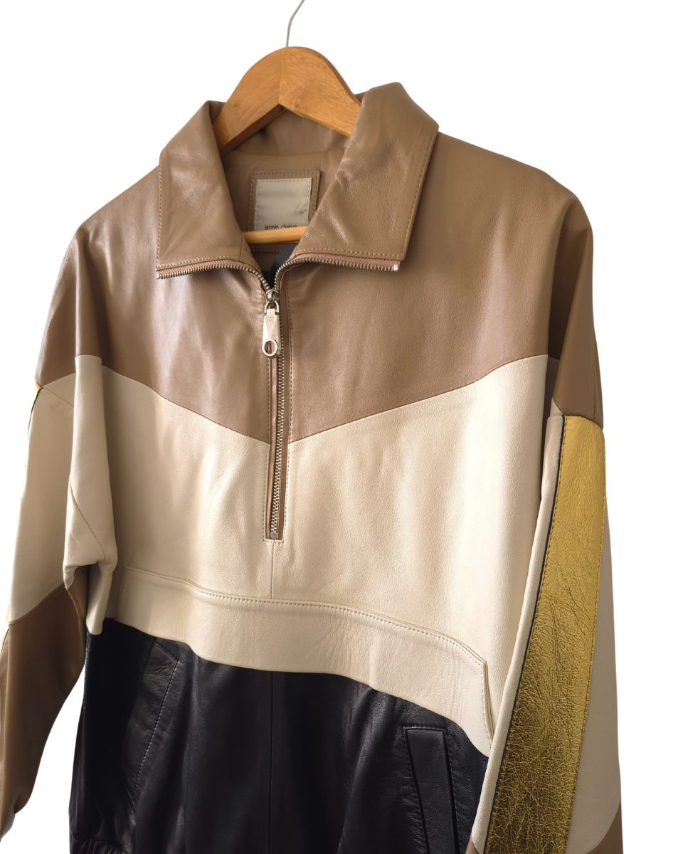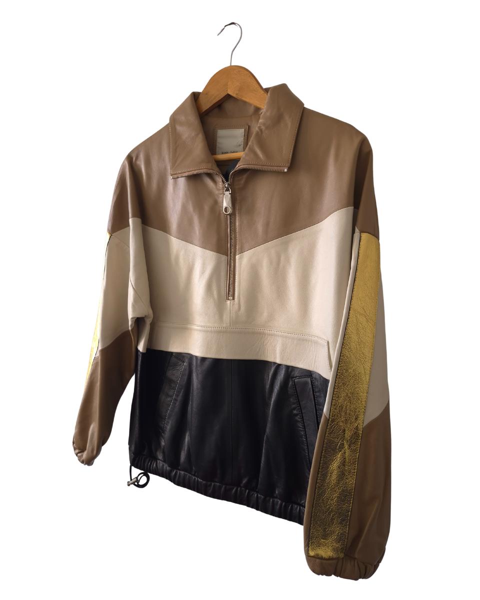 Buzo Jazmin Chebar oversize. Confeccionado en cuero ovino de alta calidad, presenta un diseño innovador con bloques que combina tonos camel, natural, negro y un impactante detalle dorado metálico en las mangas, ofreciendo una estética moderna y audaz. Posee bolsillos frontales, cuello alto y cierre de cremallera hasta la mitad, ideal para un look casual chic o para elevar cualquier outfit. Bajo ajustable con cordón y elástico para un calce perfecto y puños elásticos que brindan comodidad. Su interior es totalmente forrado en acetato negro con bordado de la marca (jch). Perfecto para combinar con jeans, pantalones de cuero o faldas, añadiendo un toque de exclusividad a tu vestuario.