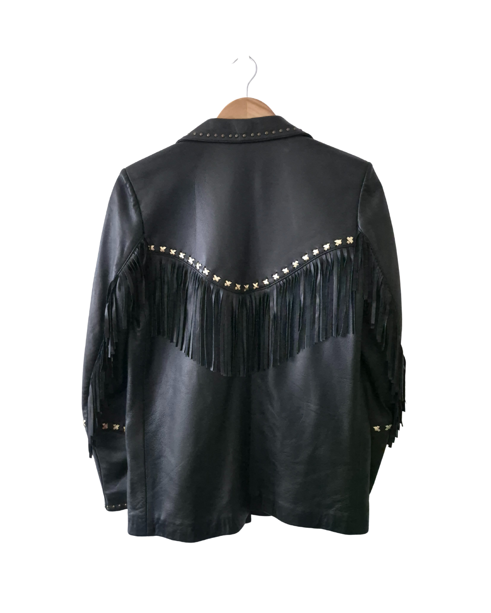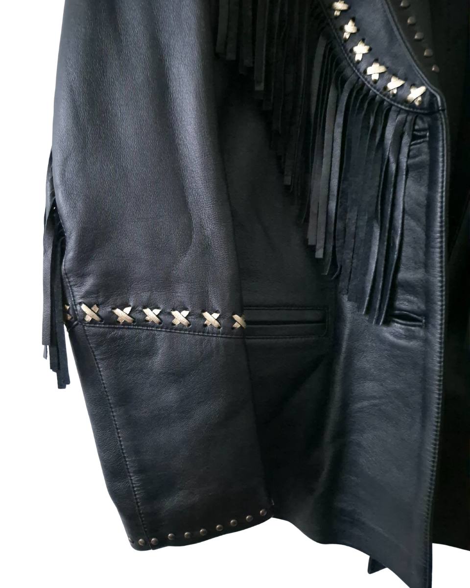 Incorpora flecos en frente, mangas y espalda, tachas en los bordes de la solapa del cuello, así como en las mangas y apliques en forma de cruz en color dorado, lo que le confiere un estilo distintivo y rockero. Su interior es totalmente forrado en acetato en color negro con inscripciones de la marca, posee un bolsillo interno. Se accede por dos botones centrales negros con insripción de la marca.