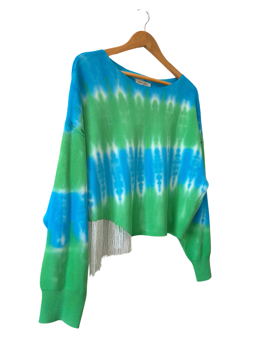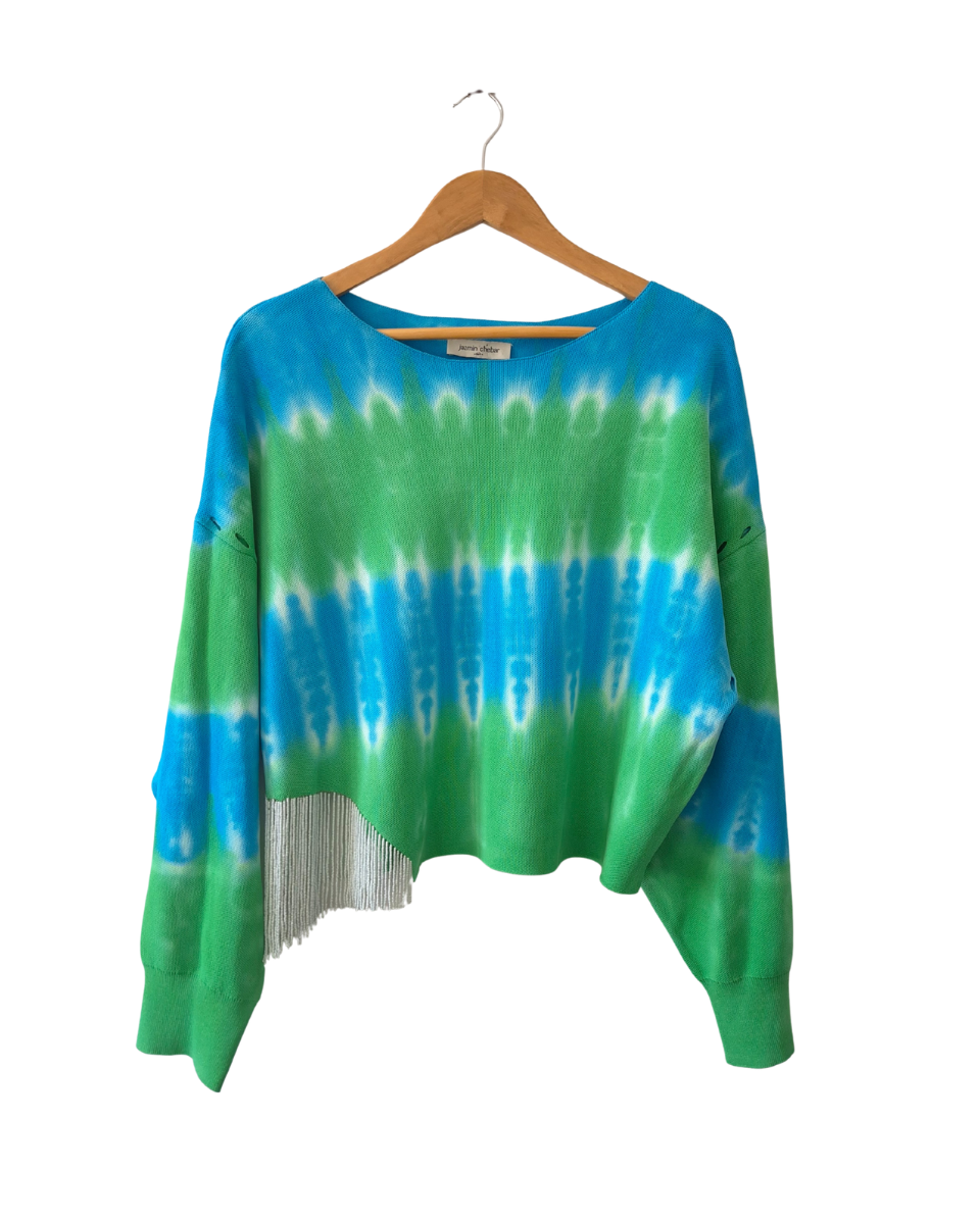 Conjunto Jazmin Chebar de sweater y falda modelo Batik. Sweater primera piel, teñido técnica batik (tie dye), flecos de canutillos en un lateral del bajo derecho, largo a hasta la cadera. La falda mantiene el mismo diseño de estampado, de corte irregular y flecos de canutillos en el lateral del bajo izquierdo.