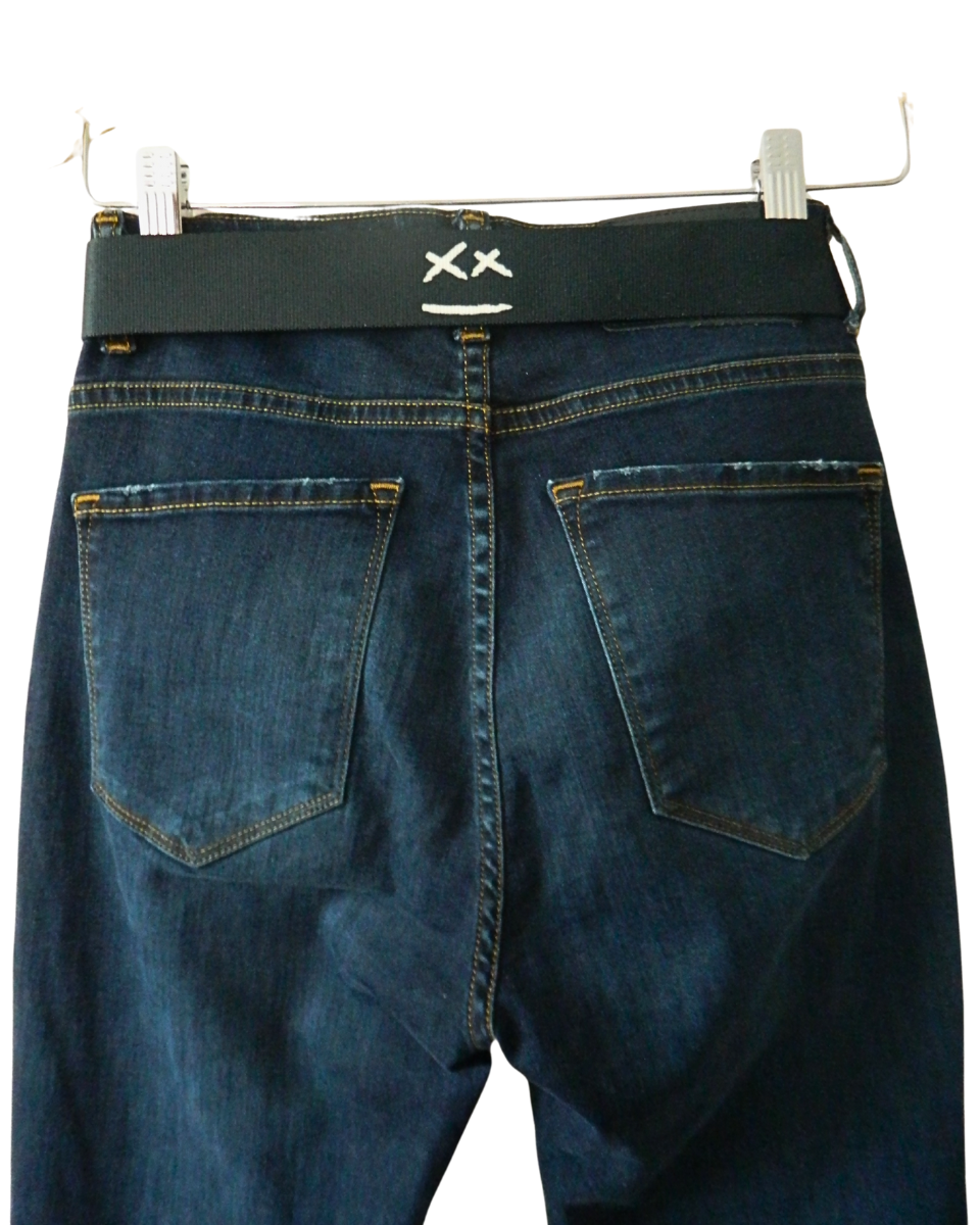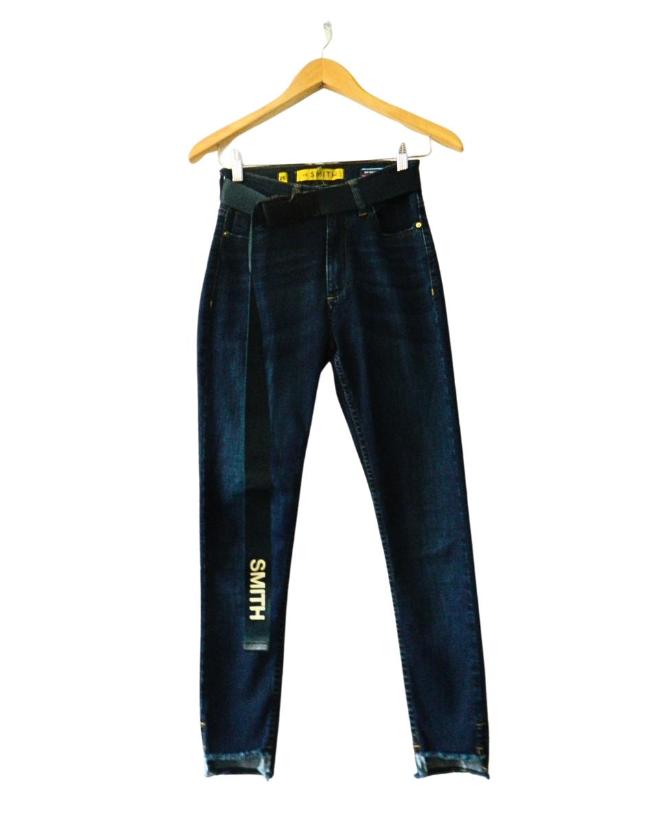 Denim Jackie Smith azul oscuro de corte skinny fit, tiro alto. Posee un cinturon de lona azul oscuro con inscipción de nombre de la marca en blanco (Smith) en un extremo, con un broche de plástico. Sus botamangas son deshilachadas mas cortas en el frente. Posee dos bolsillos en frente y dos en espalda.