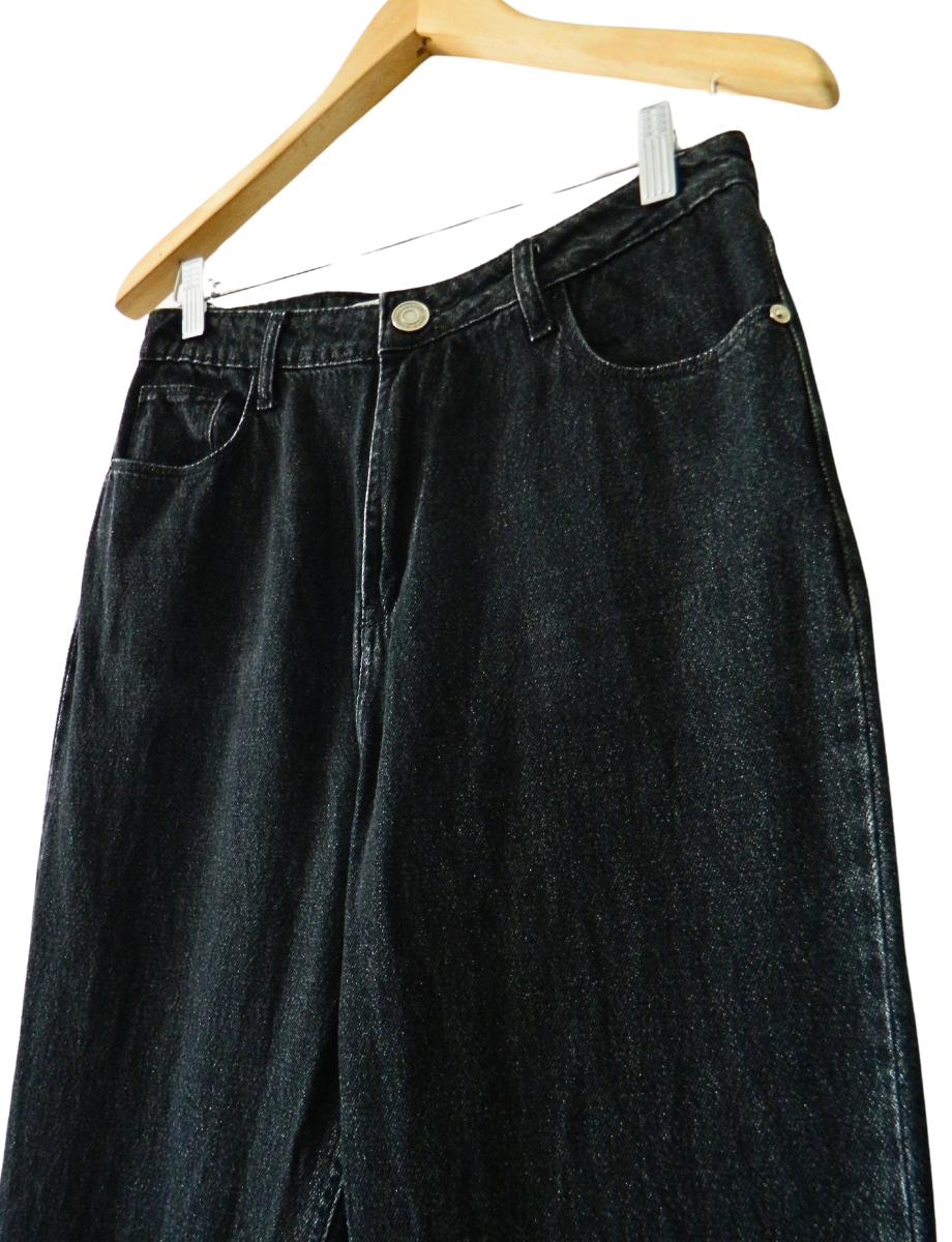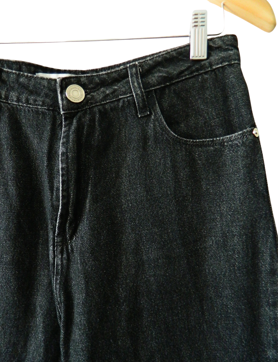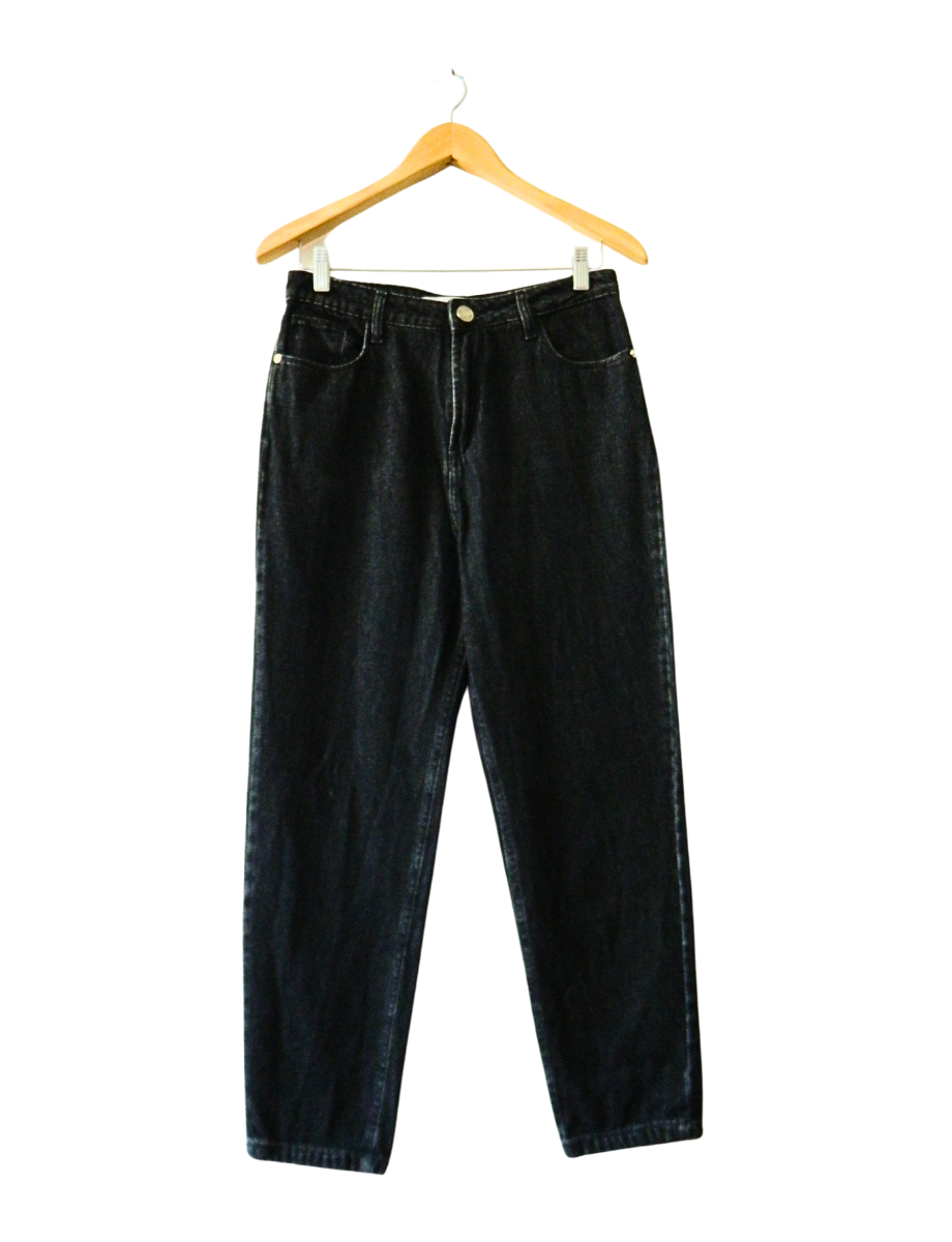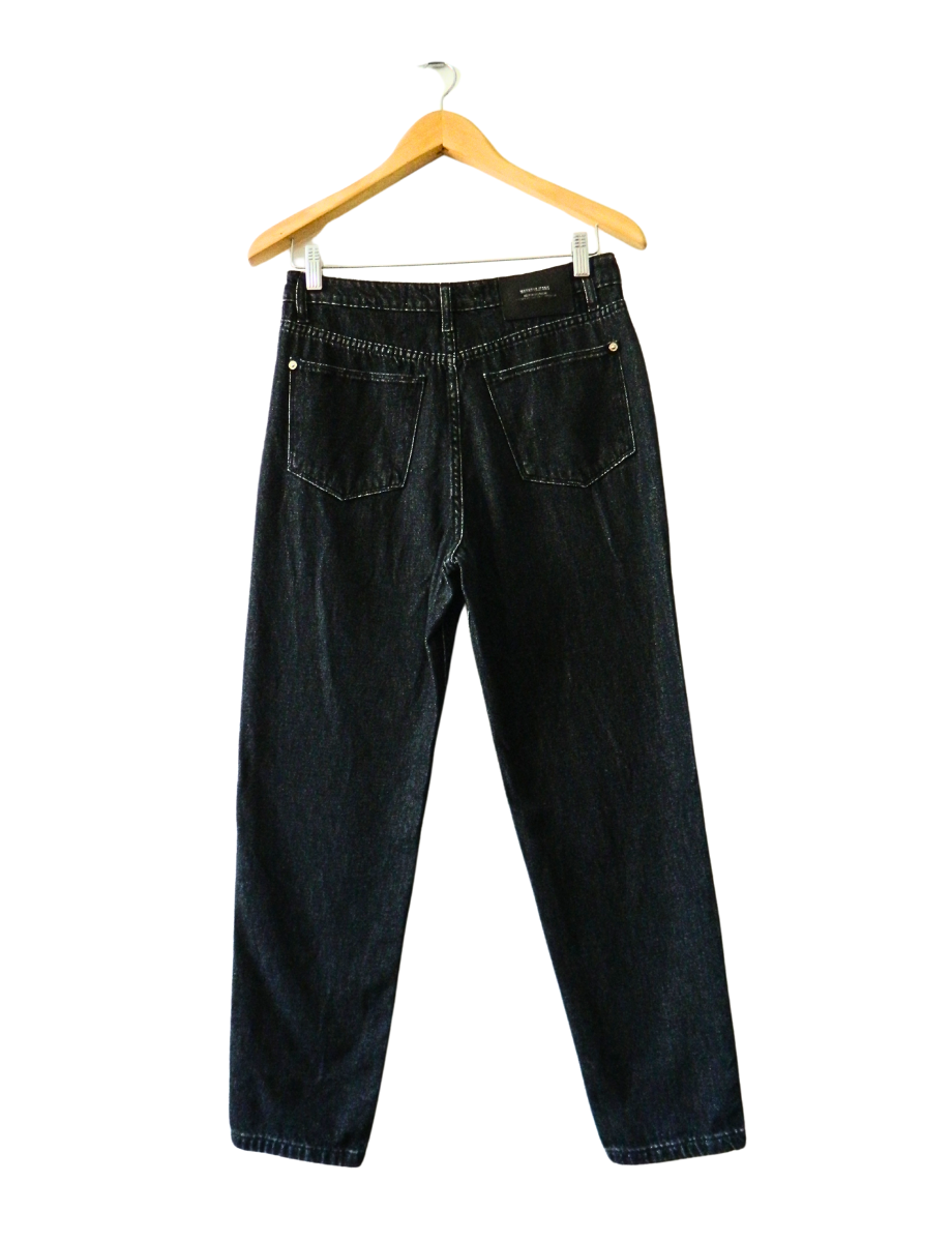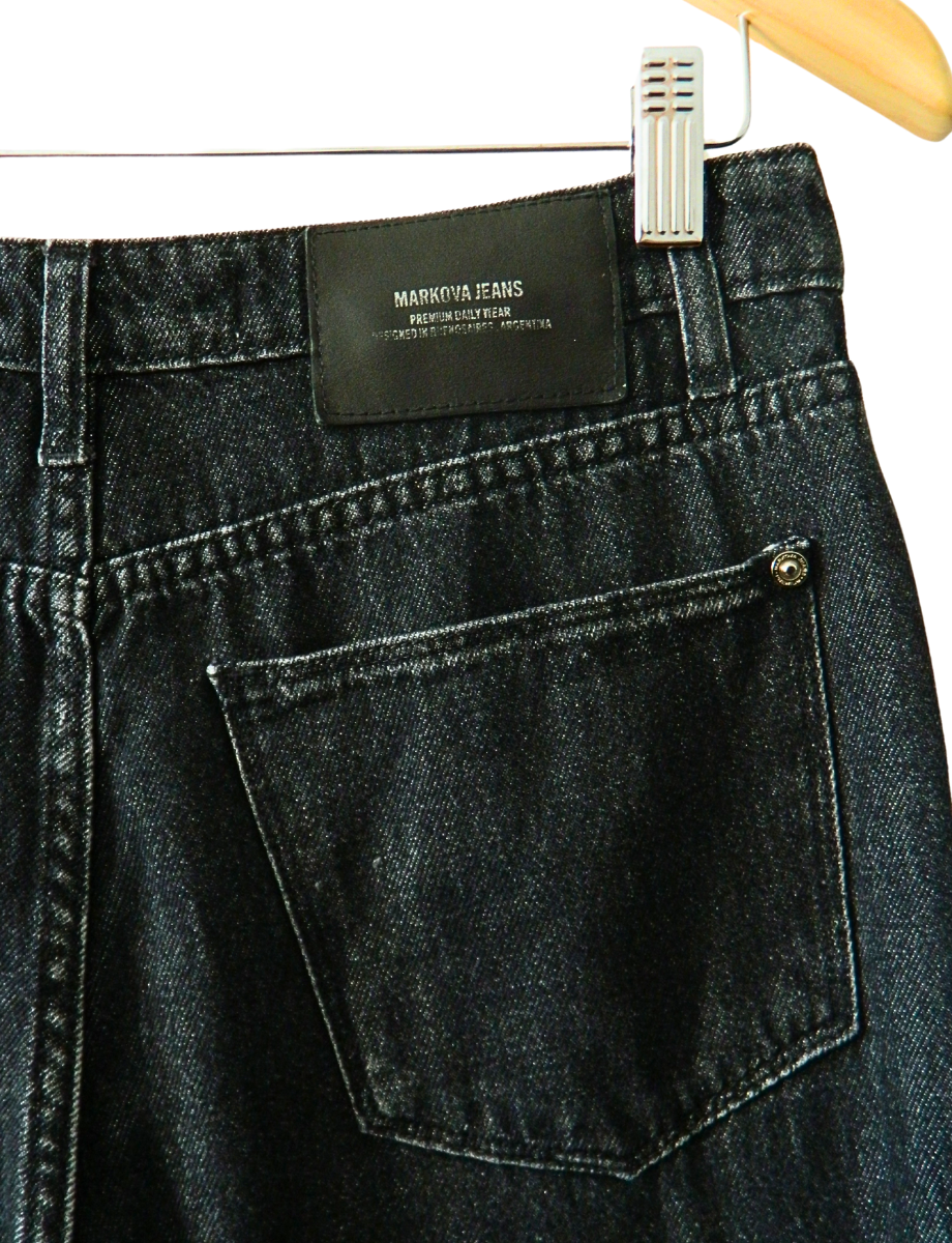 Denim Markova color negro con efecto desgastado. Su corte es mom fit y tiro alto. Presenta cinco bolsillos: tres delanteros y dos traseros. El cierre es con cremallera, posee botón y remaches metálicos con inscripciónes de la marca.