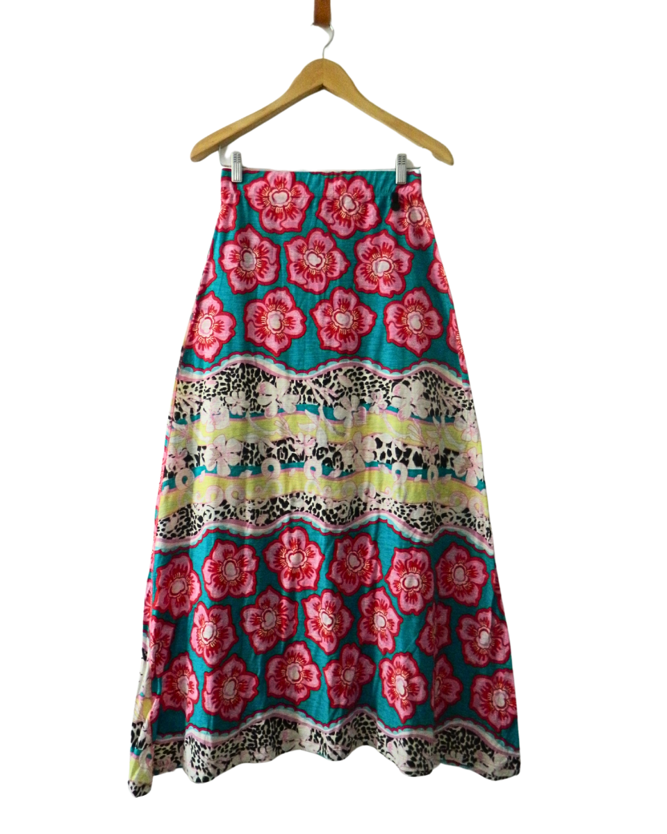 Falda Jazmin Chebar larga con elástico en cintura, estampada con flores y franjas de distintos colores: rosa, rojo, turquesa, blanco, negro, amarillo y celeste.