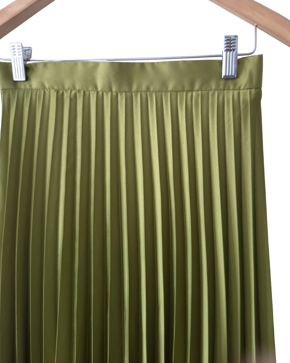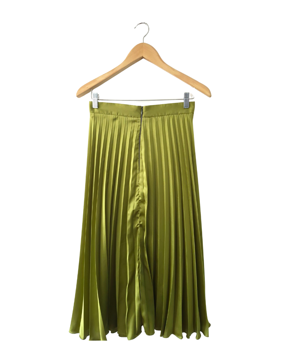 Falda Vero Alfie verde oliva. Plizada de corte midi, confeccionada en simil razo, con acceso por cremallera en espalda.