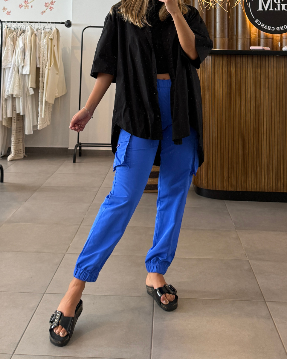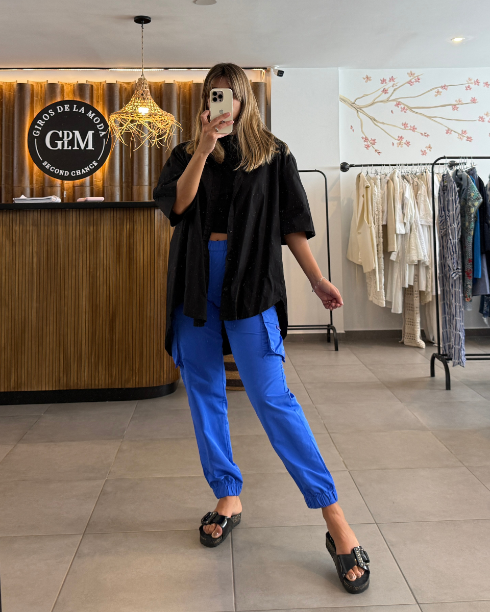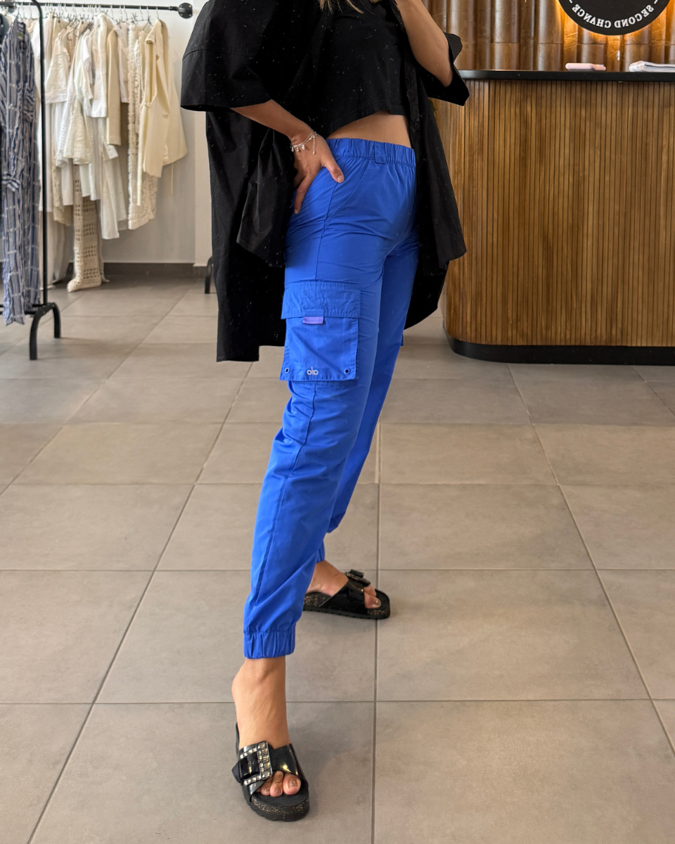 Pantalón Alo Yoga cargo tipo jogger de pierna recta y ajuste holgado, confeccionado en color azul eléctrico en mezcla de poliester. Cuenta con cintura elástica, bolsillos cargo en los laterales con el logo de la marca estampado en uno de ellos y puños elásticos en los tobillos. Se destaca por su diseño versátil que fusiona estilo urbano y ropa deportiva. Marca reconocida por fusionar ropa deportiva de alto rendimiento con estilo urbano contemporáneo.