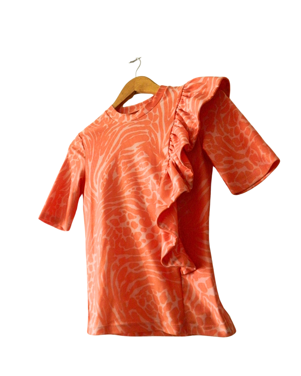Remera Cher manga corta de lycra estampada animal print color coral. Diseñada con un volado amplio que cruza el lateral izquierdo de frente a espalda.