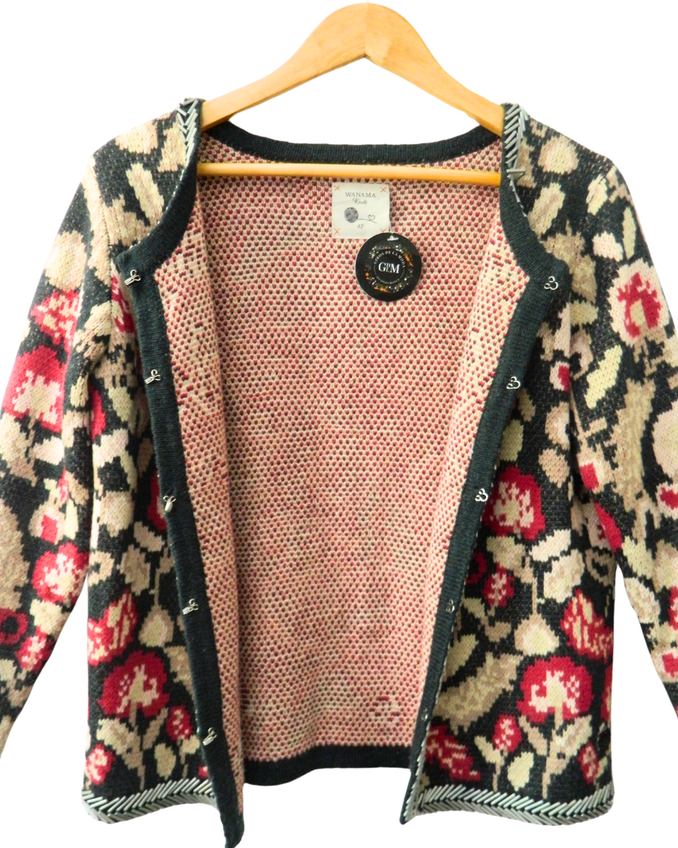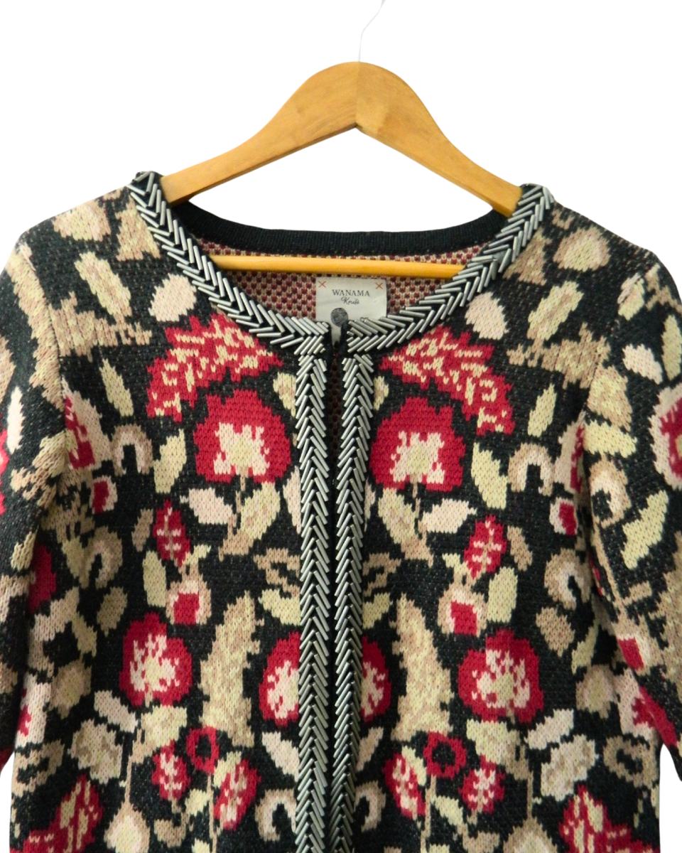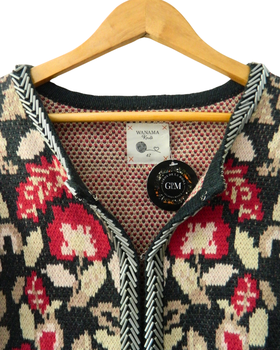 Saco Wanama tejido con dibujos de flores y canutillos bordados. Posee broches para cerrar.