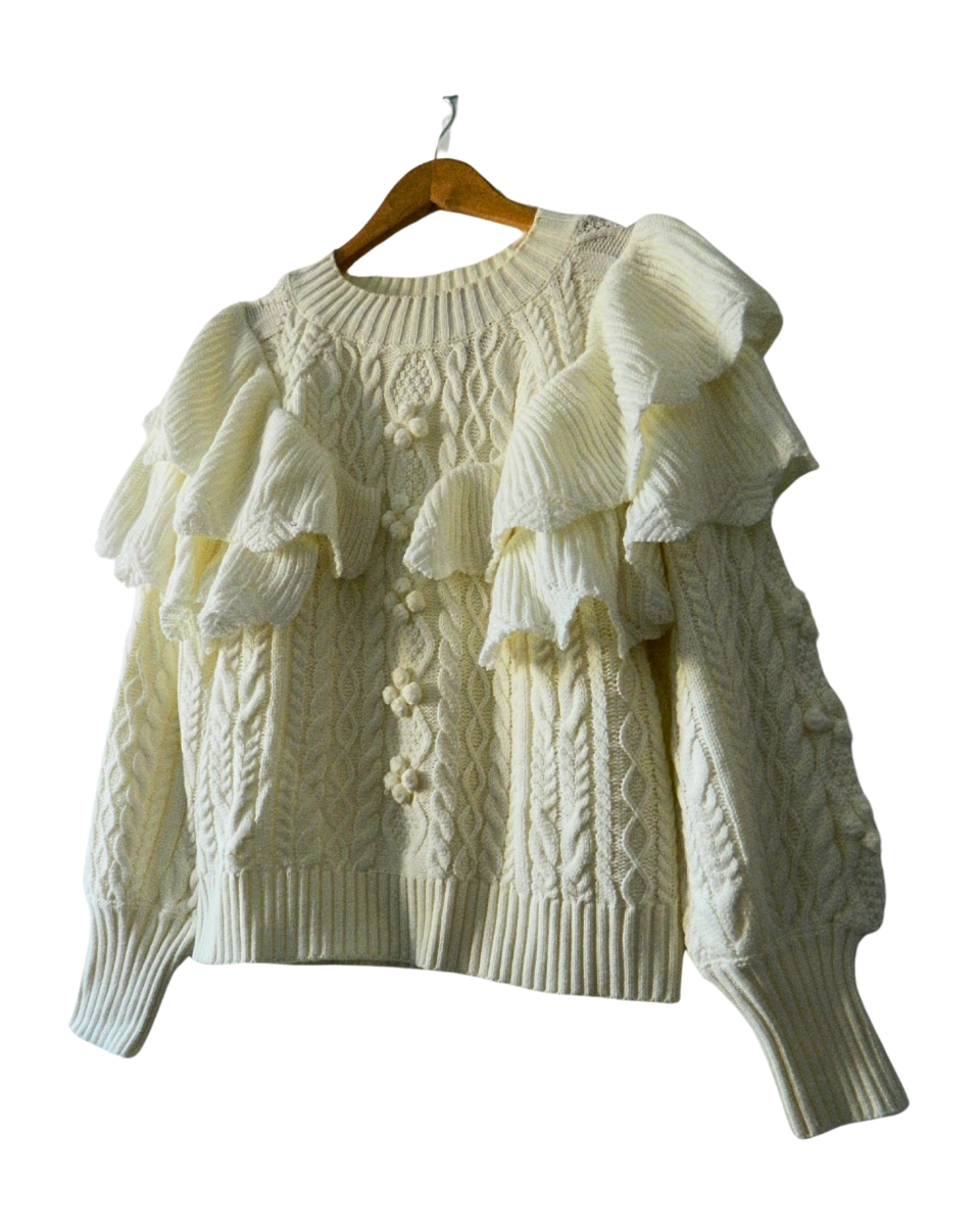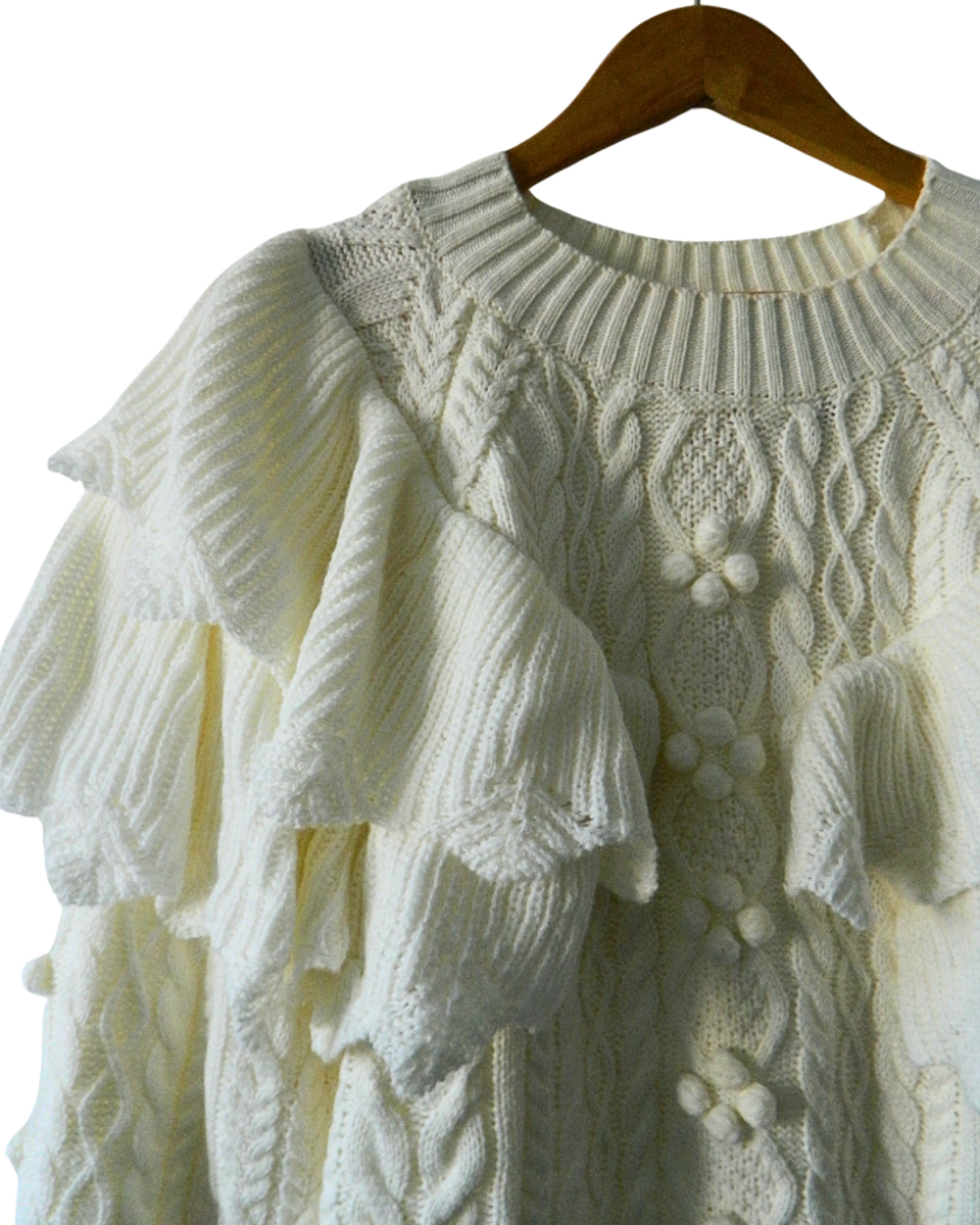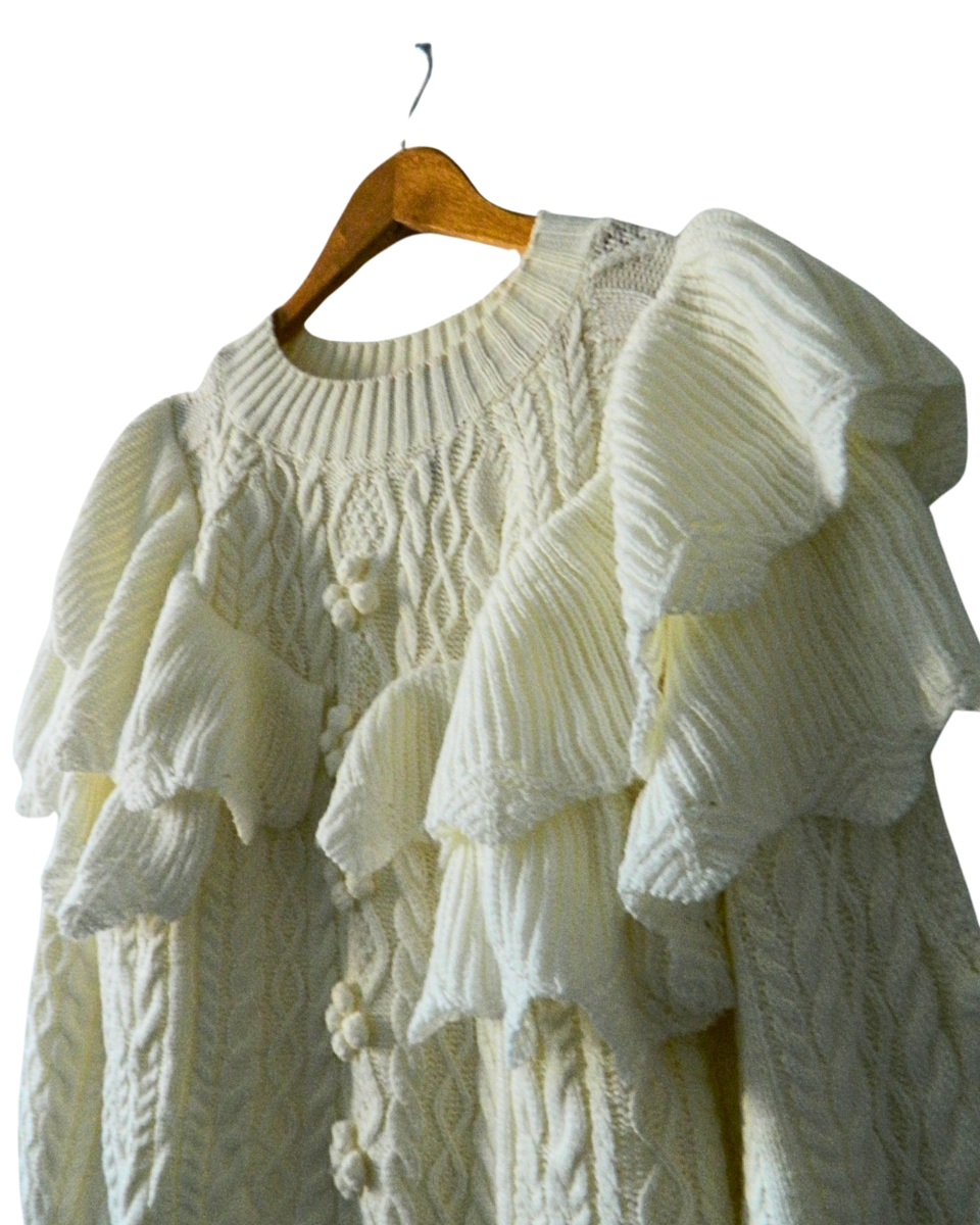 Sweater Cambodja confeccionado en tejido de punto color natural. Su diseño combina diferentes puntos, desde trenzado, hasta pop corn, posee volados en frente y espalda. Su corte es con cuello redondo, mangas holgadas y rib en cuello, puños y cadera.