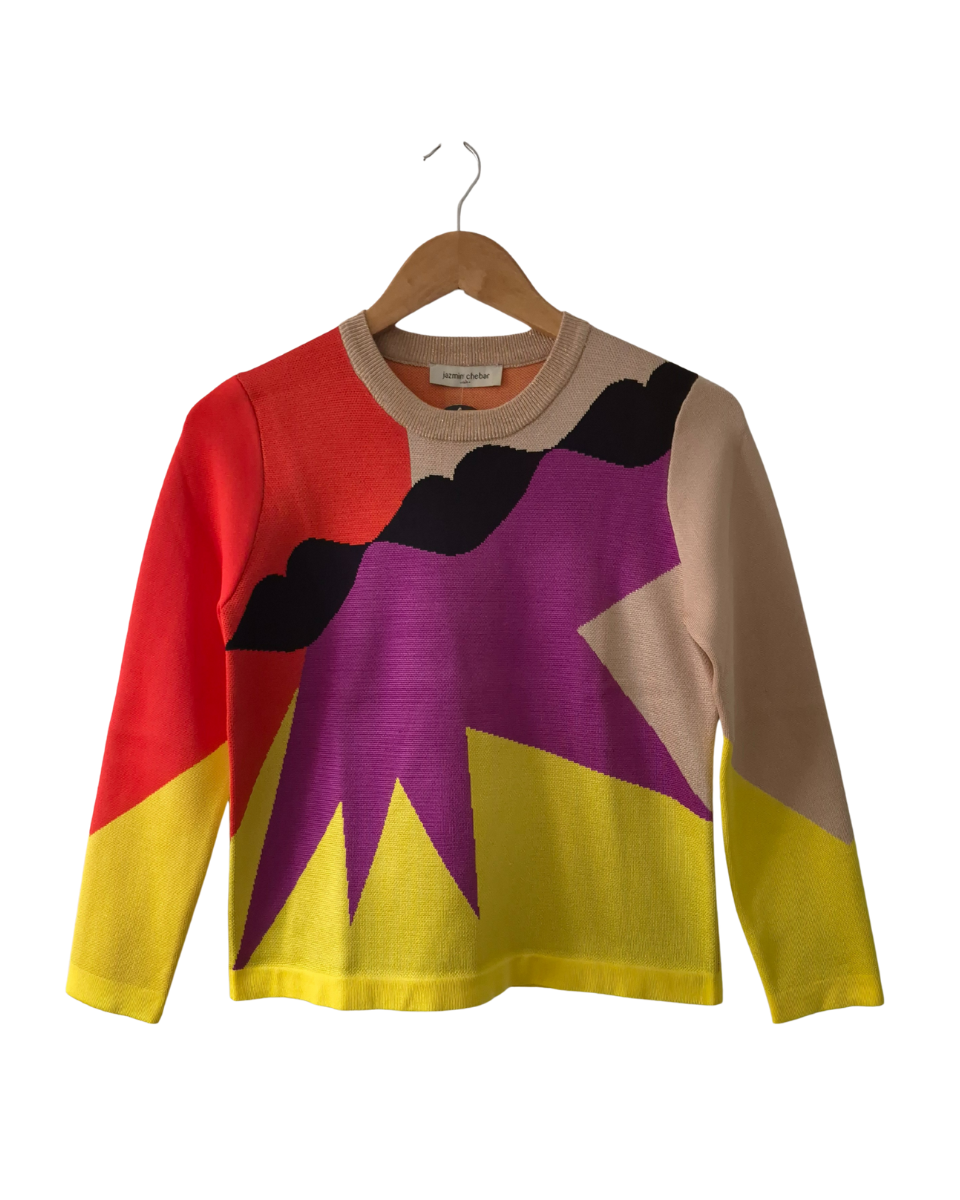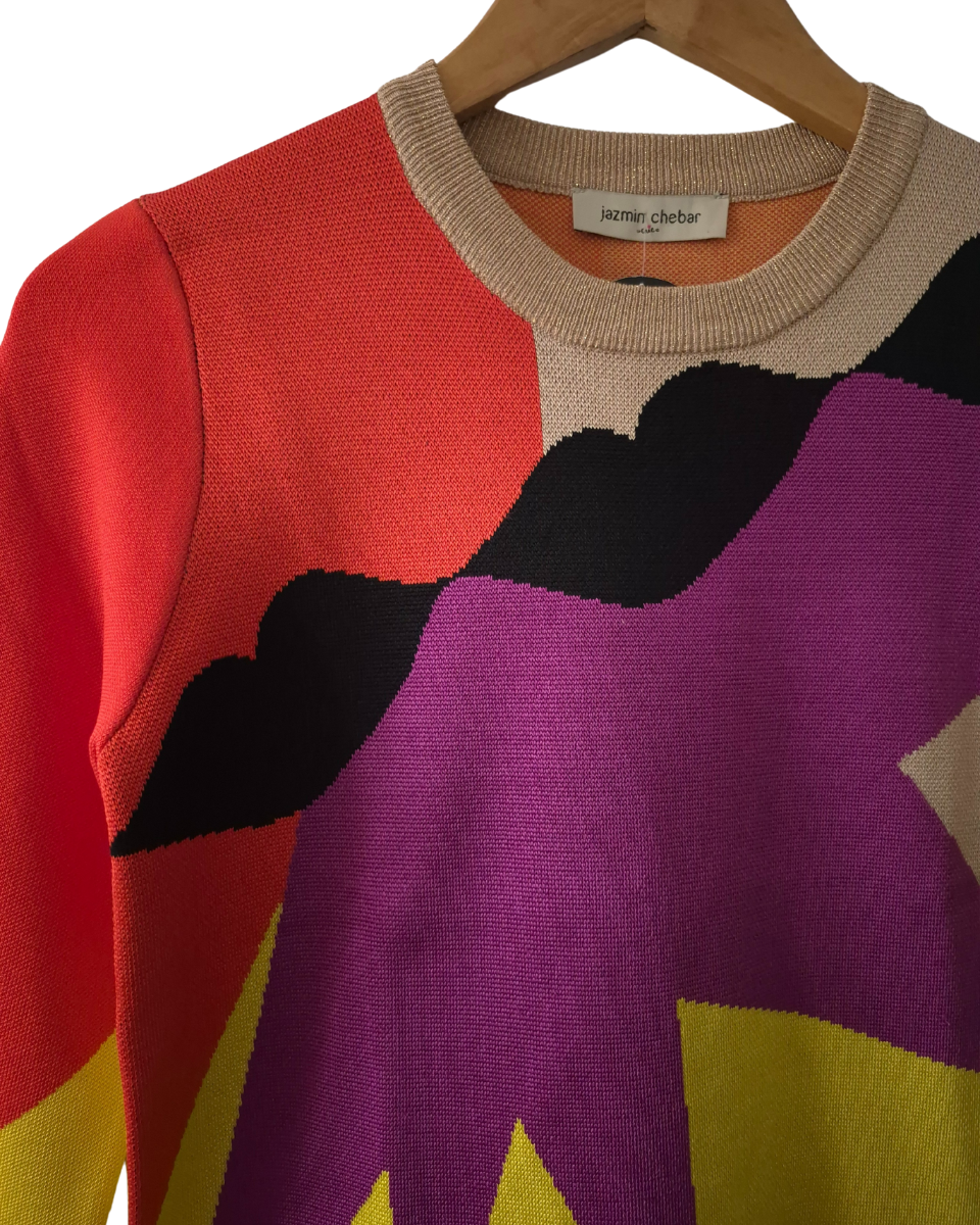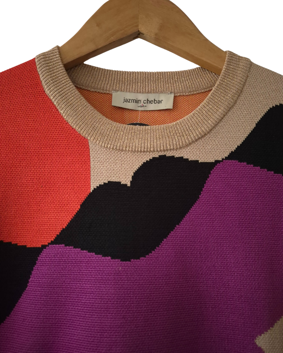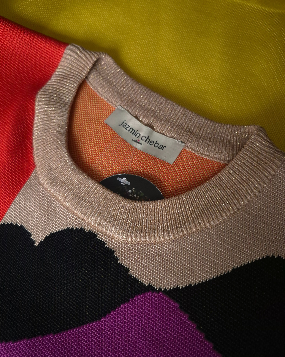 Sweater Jazmin Chebar modelo Ray. Confeccionado con materiales de alta calidad, ofrece confort y estilo sin ser pesado, lo que lo hace perfecto para diversas estaciones. Presenta un diseño de patrón abstracto con bloques de color que incluyen tonos vibrantes como el rojo, amarillo, magenta y detalles en negro y beige, creando una estética moderna y distintiva. Su cuello es redondo en rib confeccionado en lurex dorado.