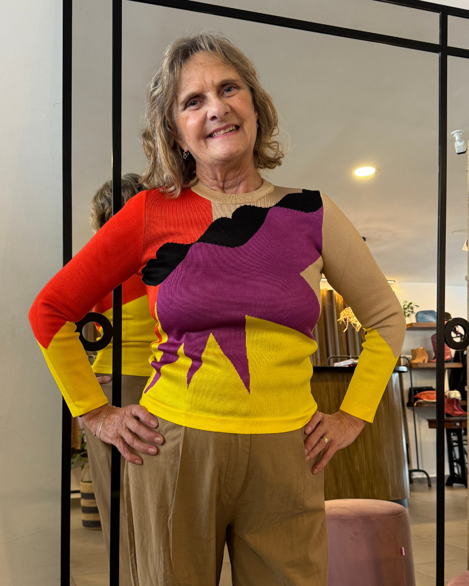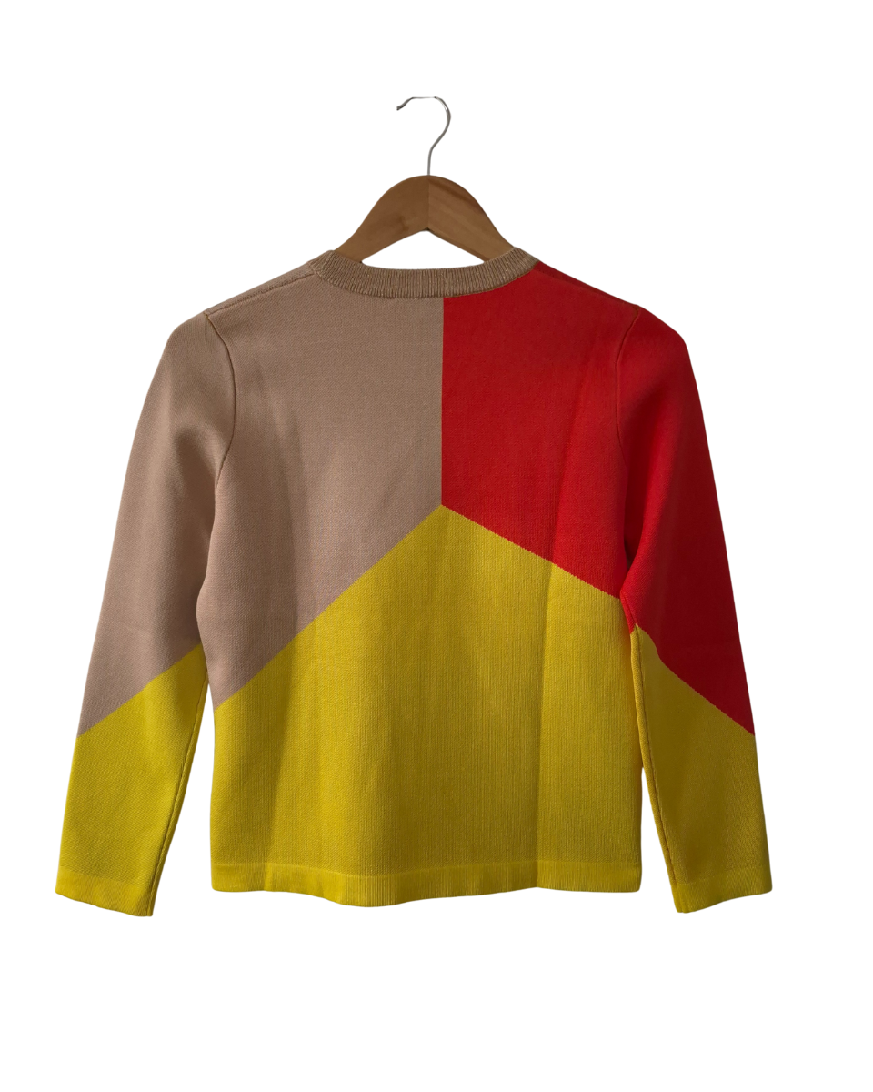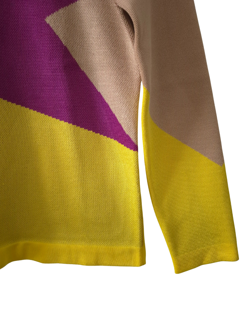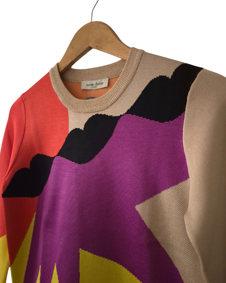 Sweater Jazmin Chebar modelo Ray. Confeccionado con materiales de alta calidad, ofrece confort y estilo sin ser pesado, lo que lo hace perfecto para diversas estaciones. Presenta un diseño de patrón abstracto con bloques de color que incluyen tonos vibrantes como el rojo, amarillo, magenta y detalles en negro y beige, creando una estética moderna y distintiva. Su cuello es redondo en rib confeccionado en lurex dorado.