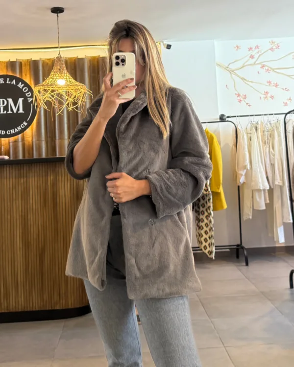 Tapado Ivana W confeccionado en piel sintética de alta calidad con un acabado aterciopelado ultra soft color gris visón. Corte de estilo oversize, ideal para usar sobre otras capas sin perder la elegancia. Cuenta con solapas clásicas y un sistema de cierre discreto con botones a presión forrados, manteniendo una estética limpia y minimalista. Su tono gris visón se adapta fácilmente a outfits casuales con jeans o looks más formales de noche. Totalmente forrado en su interior. Combinalo con unos jeans rectos y botas cortas para un estilo urban chic, o llevalo sobre un vestido para una salida nocturna.