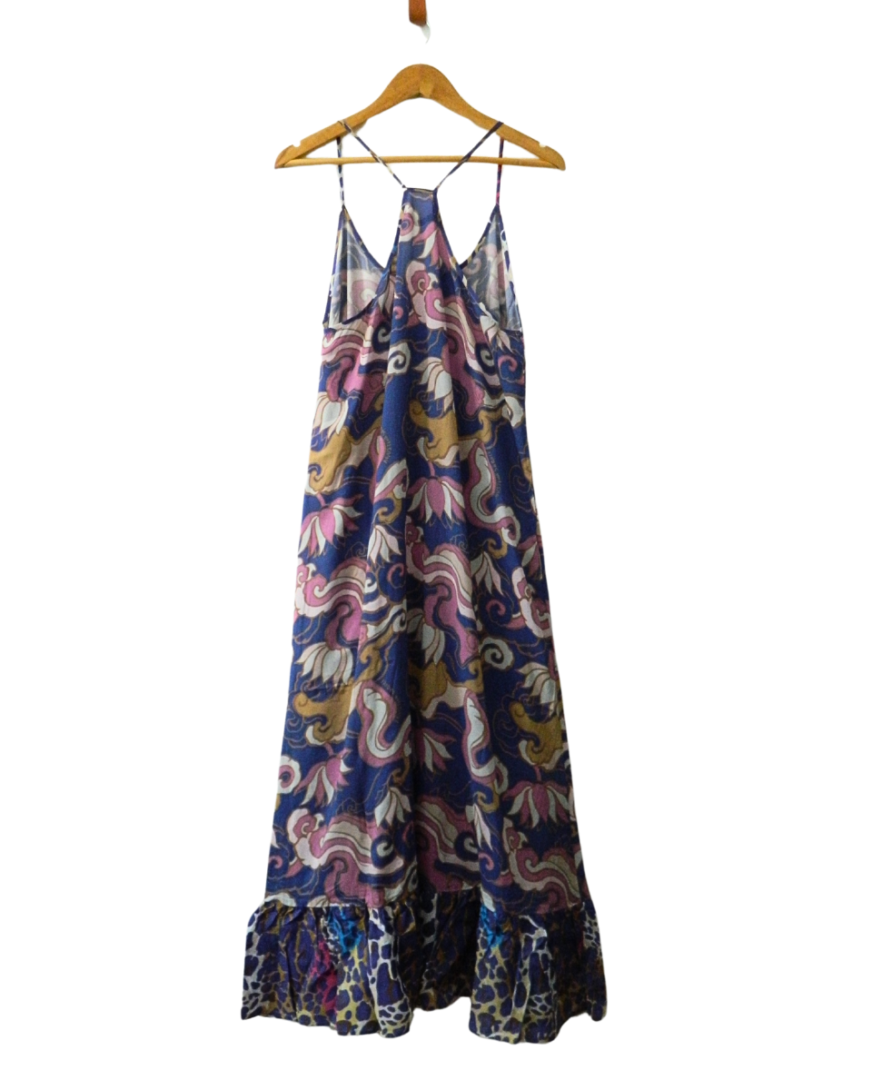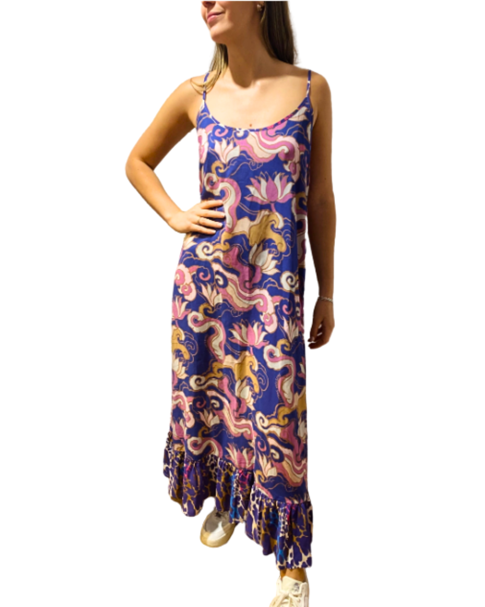 Vestido Agustina Saquer solero con breteles y volado en el inferior de la falda. Azul con estampado de arabescos y flores en rosa, lila, marron, beige, celeste y natural, las costuras del escote, breteles y el volado inferior son en animal print.