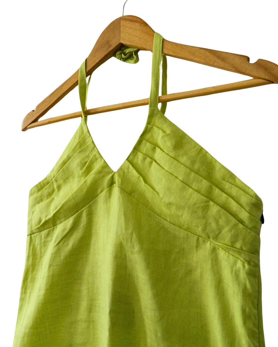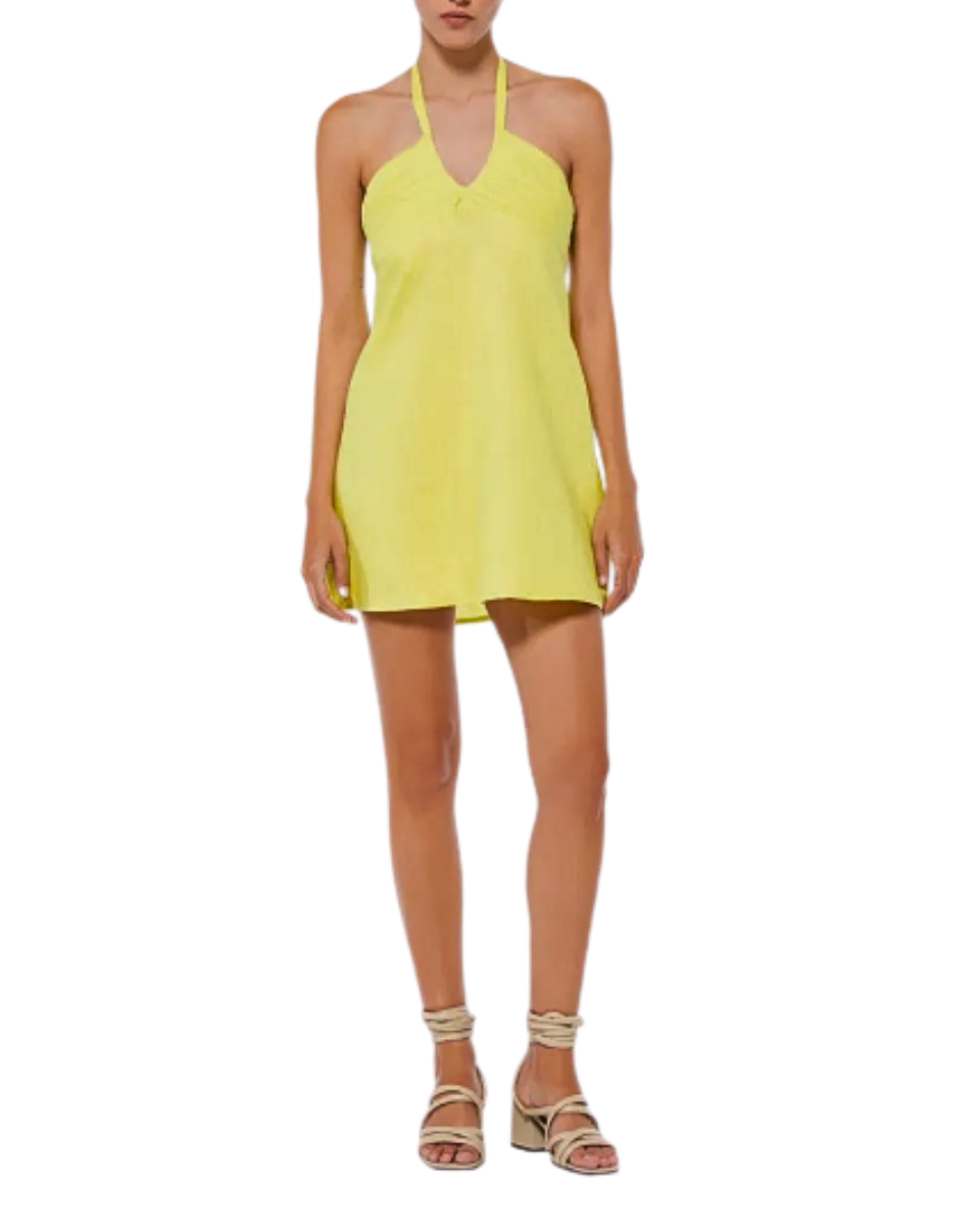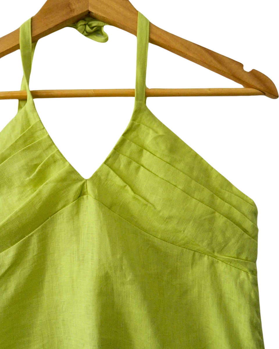Vestido Ayres modelo Reflejo color Lima. Diseño corto, confeccionado 100% en lino, con breteles que se sujetan al cuello y espalda al descubierto que contiene apertura lateral a través de cierre invisible, detalle de frunces en frente y espalda que enamoran.
