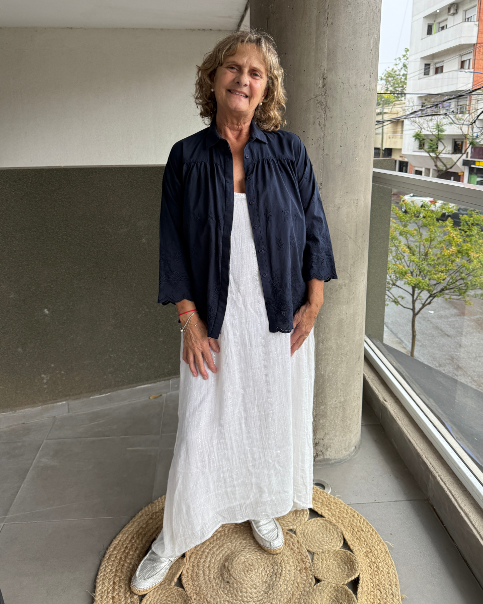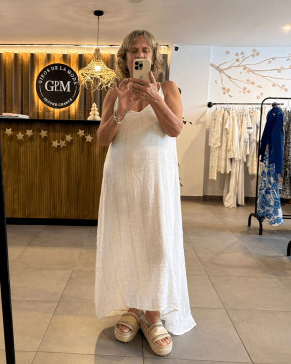 Vestido Cher largo confeccionado en algodón blanco con fibras metálicas que le otorgan un sutil brillo plateado. Modelo largo, con caída por debajo del tobillo. Parte superior con escote en v y breteles finos regulables. Totalmente forrado para mayor comodidad. Un vestido versátil que te acompaña en diversos ocasiones, en blanco color tendencia para el 2026.