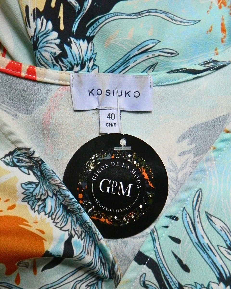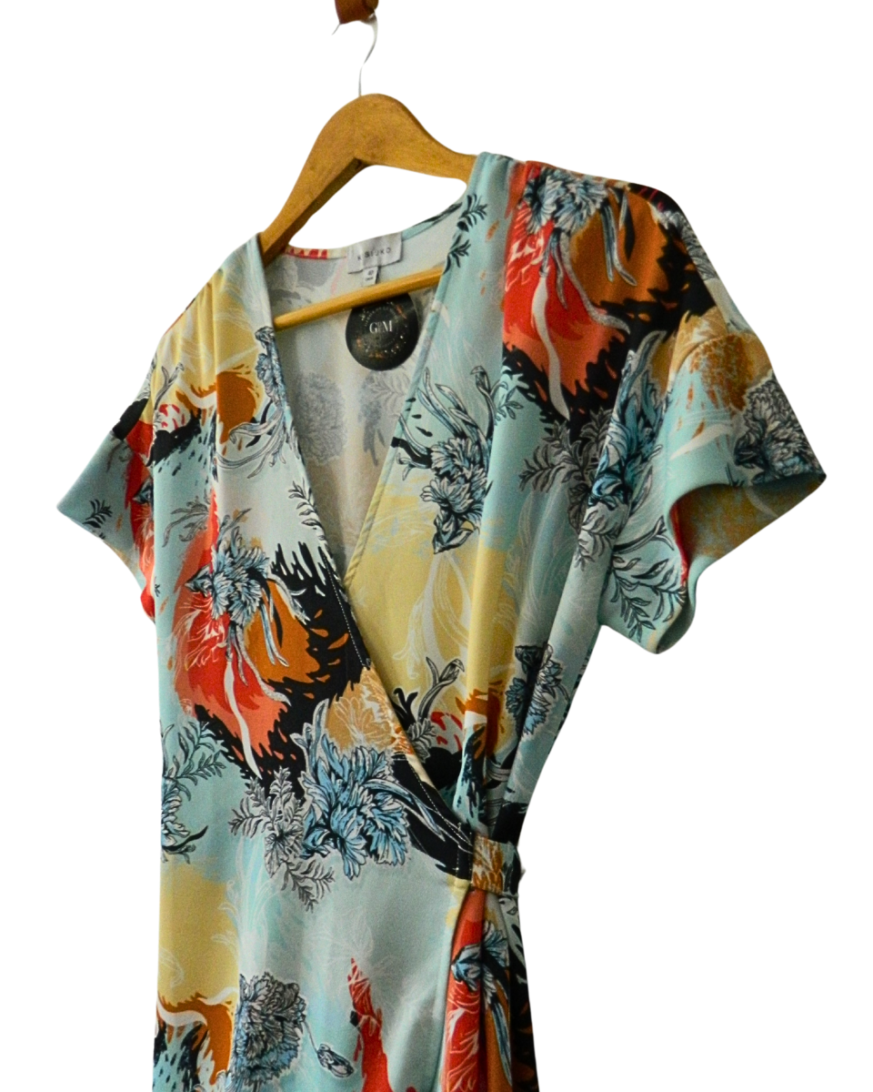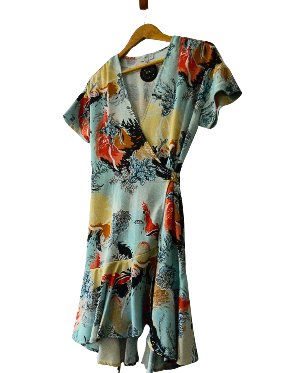 Vestido Kosiuko modelo Helena Flower. Diseñado cruzado al frente y atado en espalda, con mangas cortas, volado en parte inferior, mas corto en frente. Estampado en celeste, natural, rojo, rosa, azul y ocre.