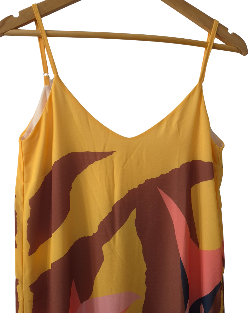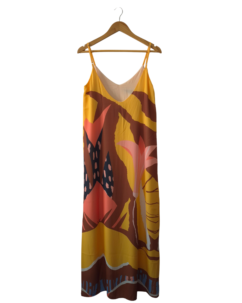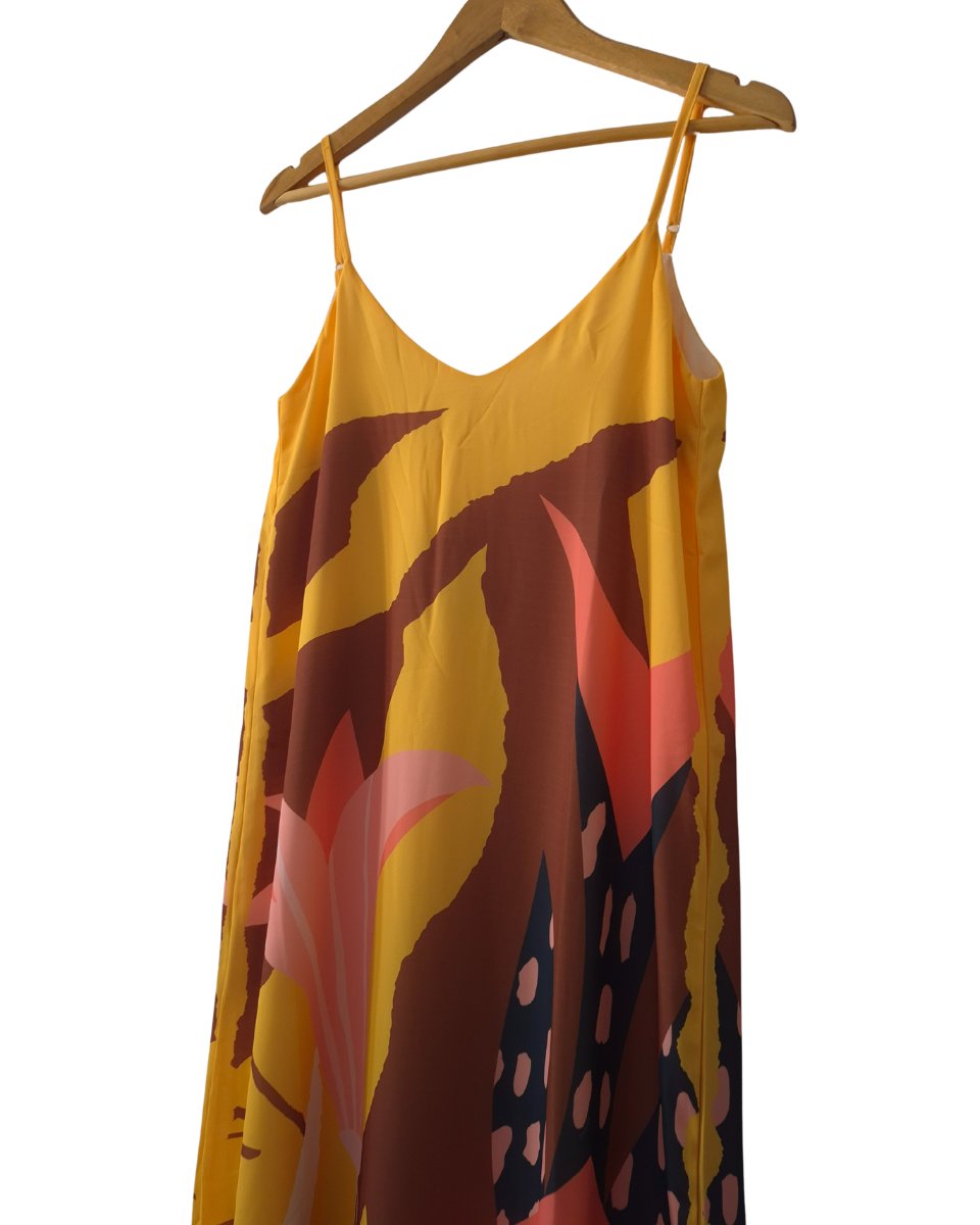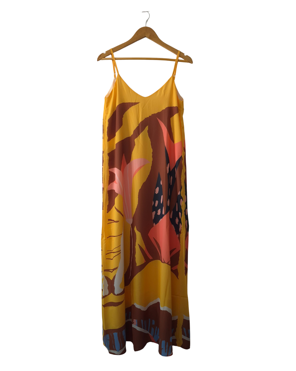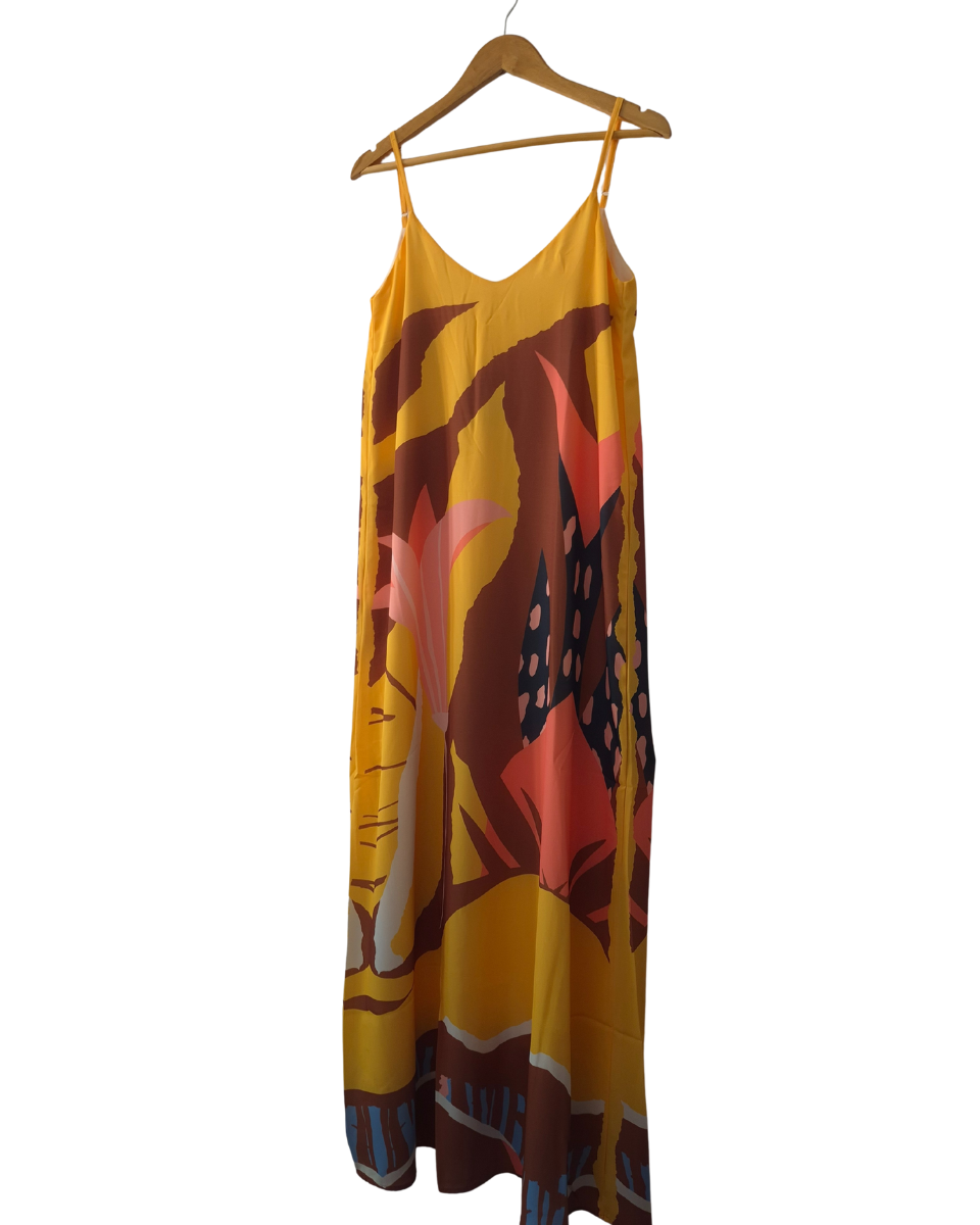 Este vestido largo estampado de Ossira es la prenda ideal para un look fresco y lleno de estilo. Ofrece una textura suave, liviana y con una caída espectacular, perfecta para los días cálidos o cualquier ocasión casual. Su diseño presenta un estampado único y llamativo en tonos amarillos, rosas, tostados y acentos oscuros, aportando un toque femenino y relajado. Cuenta con breteles finos regulables en la espalda para un ajuste personalizado, un escote amplio en espalda y forrado totalmente en su interior.
