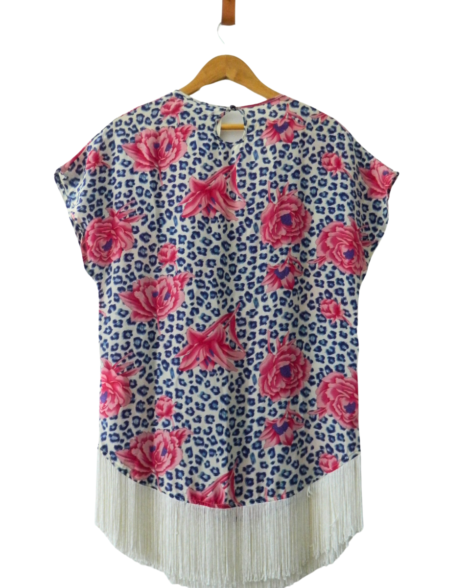 Vestido Rapsodia de seda blanco con estampado Animal Print azul y flores rosas. Posee flecos blancos en borde inferior.