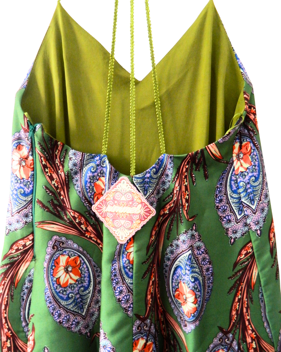 Vestido Rimmel color verde con estampado de arabescos y flores en colores rosa, bordó, salmón, azul y blanco. Con tiras verdes al cuello y espalda. Forrado, con cierre en costado.
