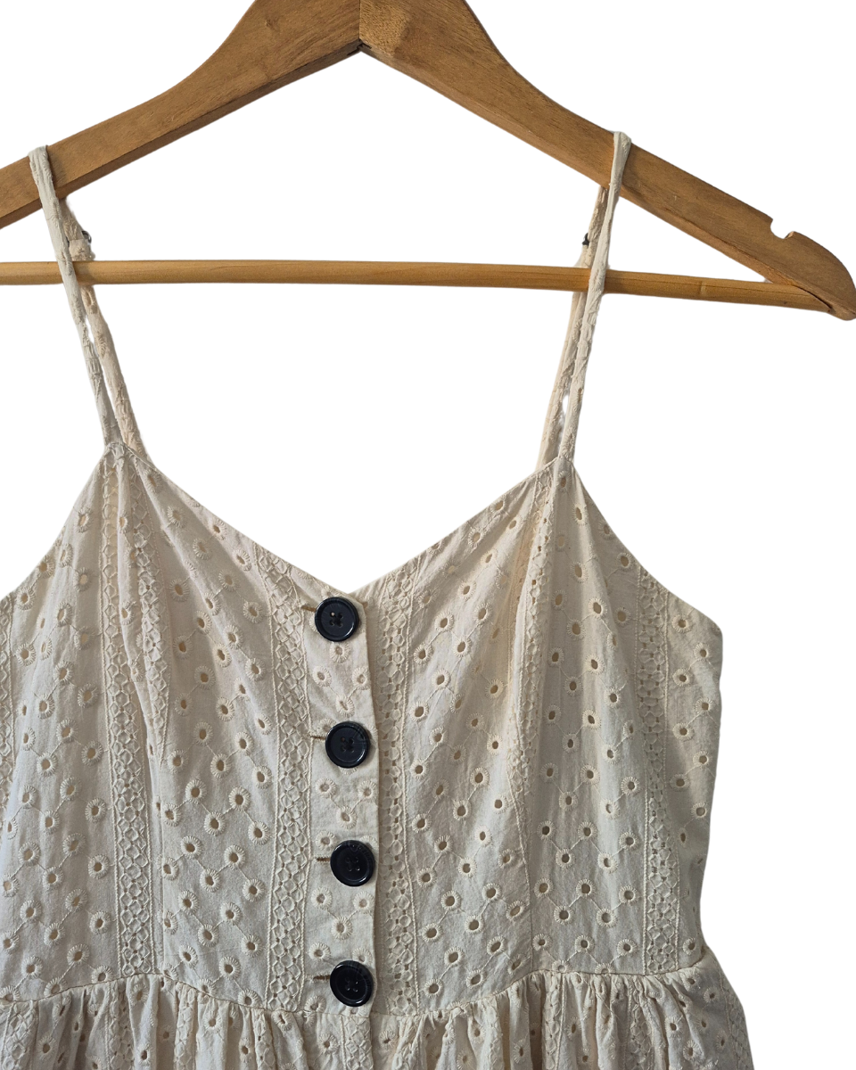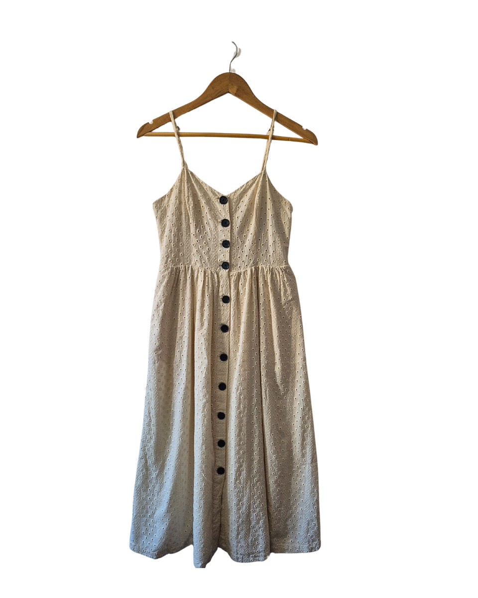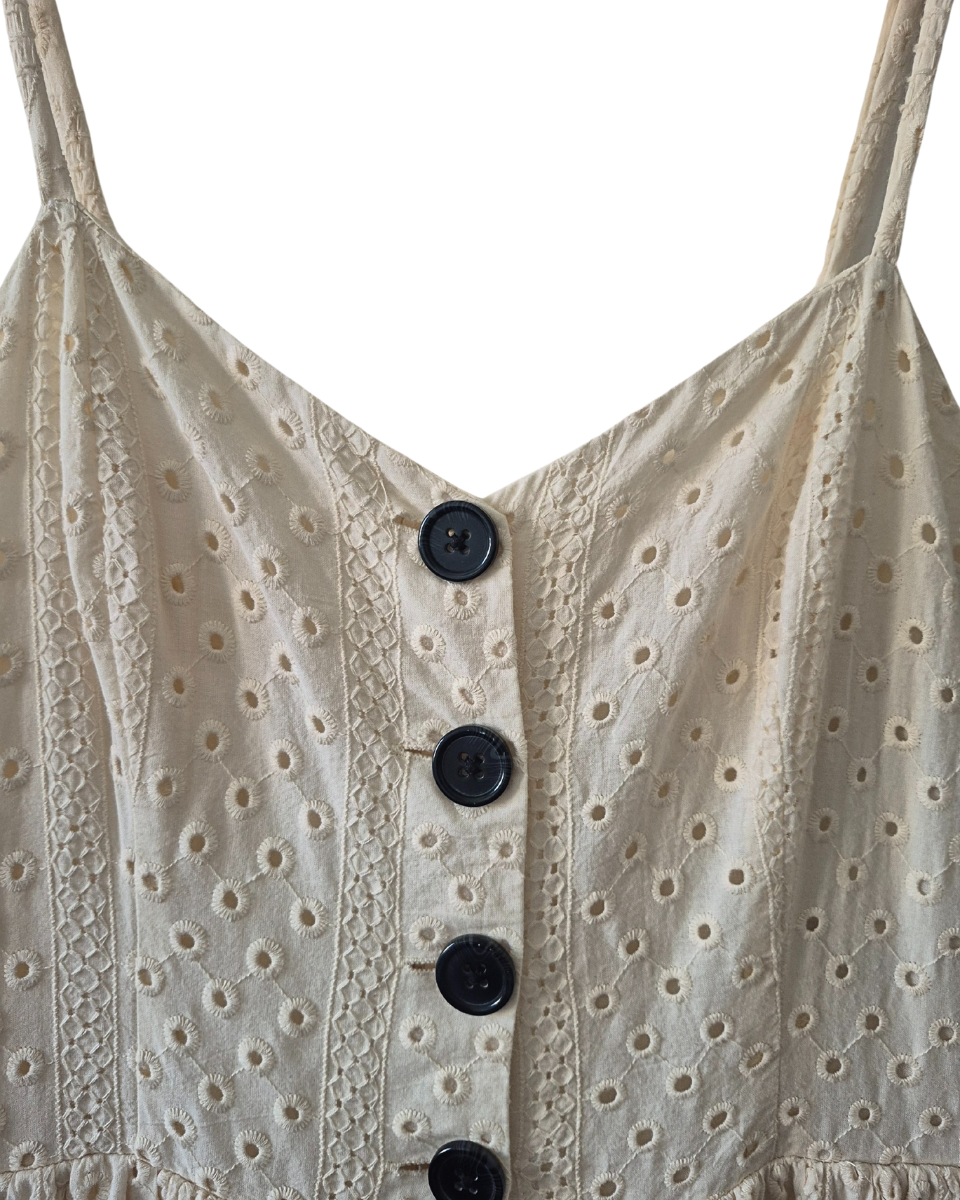 Vestido Urban Outfitters modelo Abbie. Confeccionado en broderie color natural. Su corte es largo, entallado en la cintura lo que le da una caida perfecta a la falda, posee botones centrales en color carey negros, breteles ajustables, espalda bordada elastizada y bolsillos en los laterales. Su interior es totalmente forrado en mismo color.