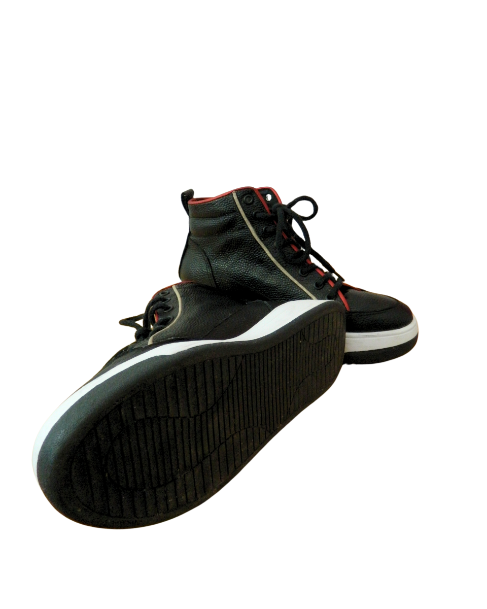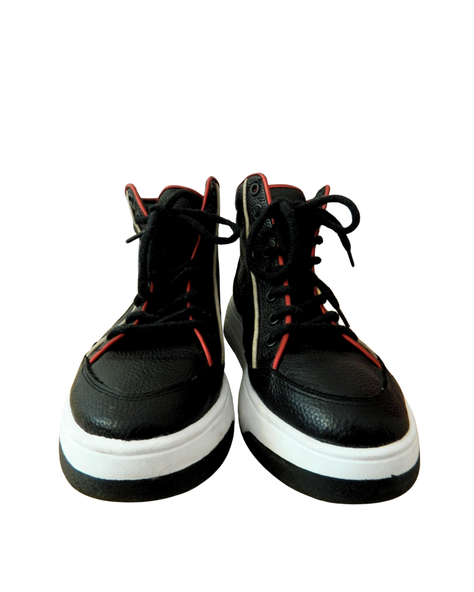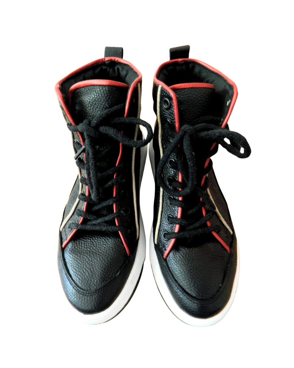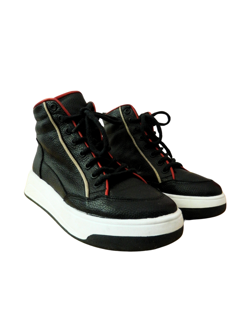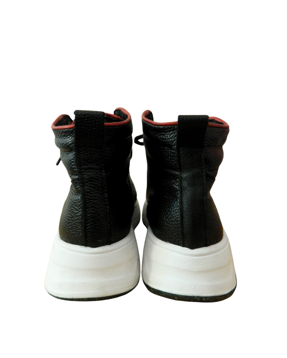 Zapatillas botitas Sofi Martire de cuero negras con cordones. Poseen bordes en color rojo y blanco. Suela en color blanco y negro.